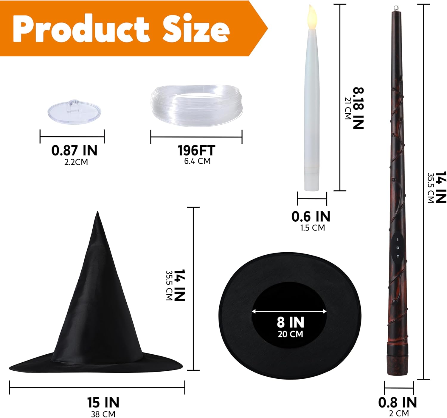 • Ultimate Magic Bundle: 84 Pieces, Includes 13 LED taper candles, 1 wand remote, 1 standard 10-key remote, 7 wizard hats (featuring classic black witch hat designs and mystical styles), 20 traceless adhesive hooks, 1 transparent fishing line, 40 glue points, and an instruction manual. Everything you need to haunt ceilings, walls, or doorways!