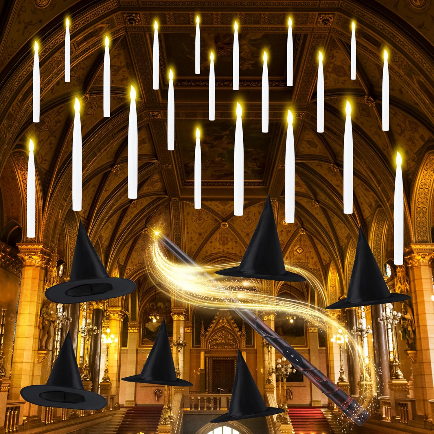 JOYIN 20Pcs Halloween Floating Candles and Witch Hat Light Up with Wand Remote Set Magic Hanging Candles and Wizard Hat with 2 Light Mode and Timer for Halloween Window Ceiling Porch Theme Party Decor