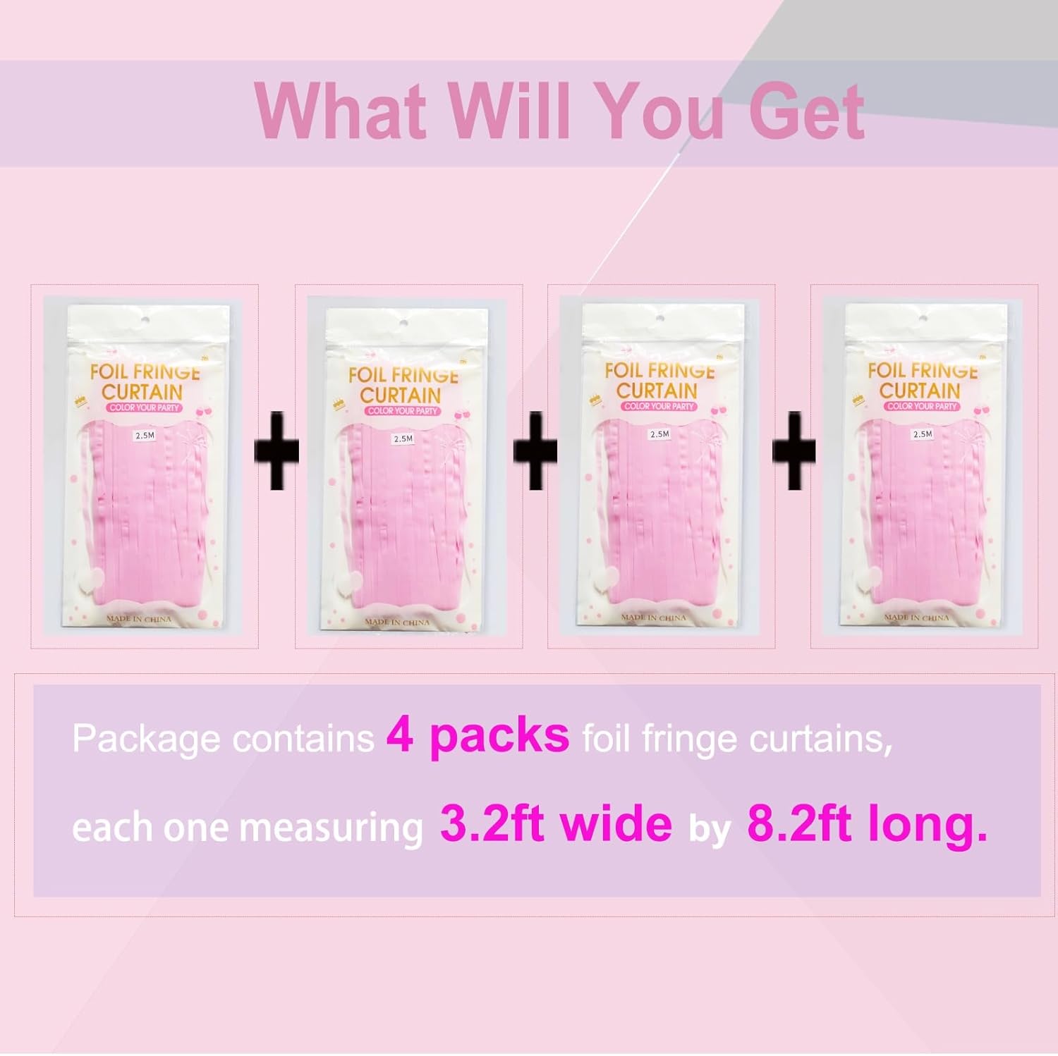 Pastel Pink Birthday Decorations - 4 Pack of 3.2x8.2ft Pink Foil Fringe Curtains Streamers Backdrop for Birthday Valentines Party Decoration