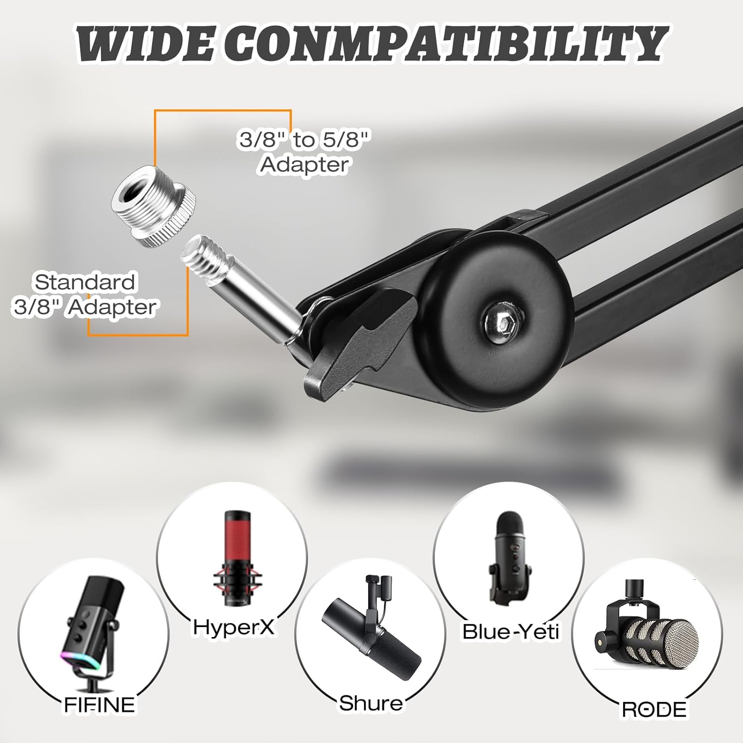 • Universal Compatibility Designed to fit most dynamic and condenser mics, this microphone boom arm comes with a reinforced 3/8" screw, 3/8" to 5/8" adapter, and mic clip. Compatible with Blue Yeti, HyperX QuadCast, Shure SM7B, AT2020, and other popular models. (Shock mount not included)
