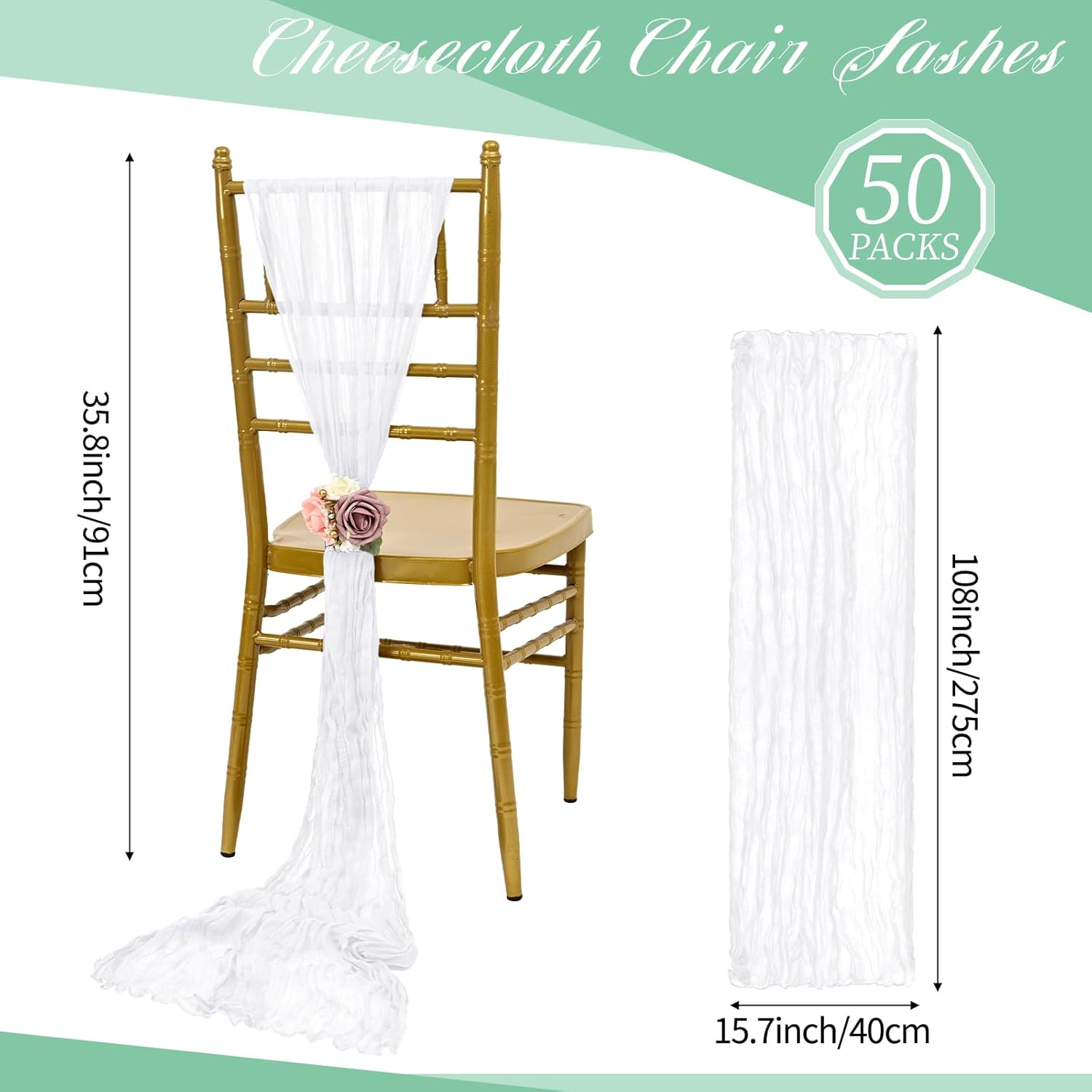 50 PCS Cheesecloth Chair Sashes, Bows Designed ChairSashes, 15.7x108 inch Chair Sashes for Aisle Decorations Universal Chairs Cover Decoration for Wedding Reception Party Banquet (White)