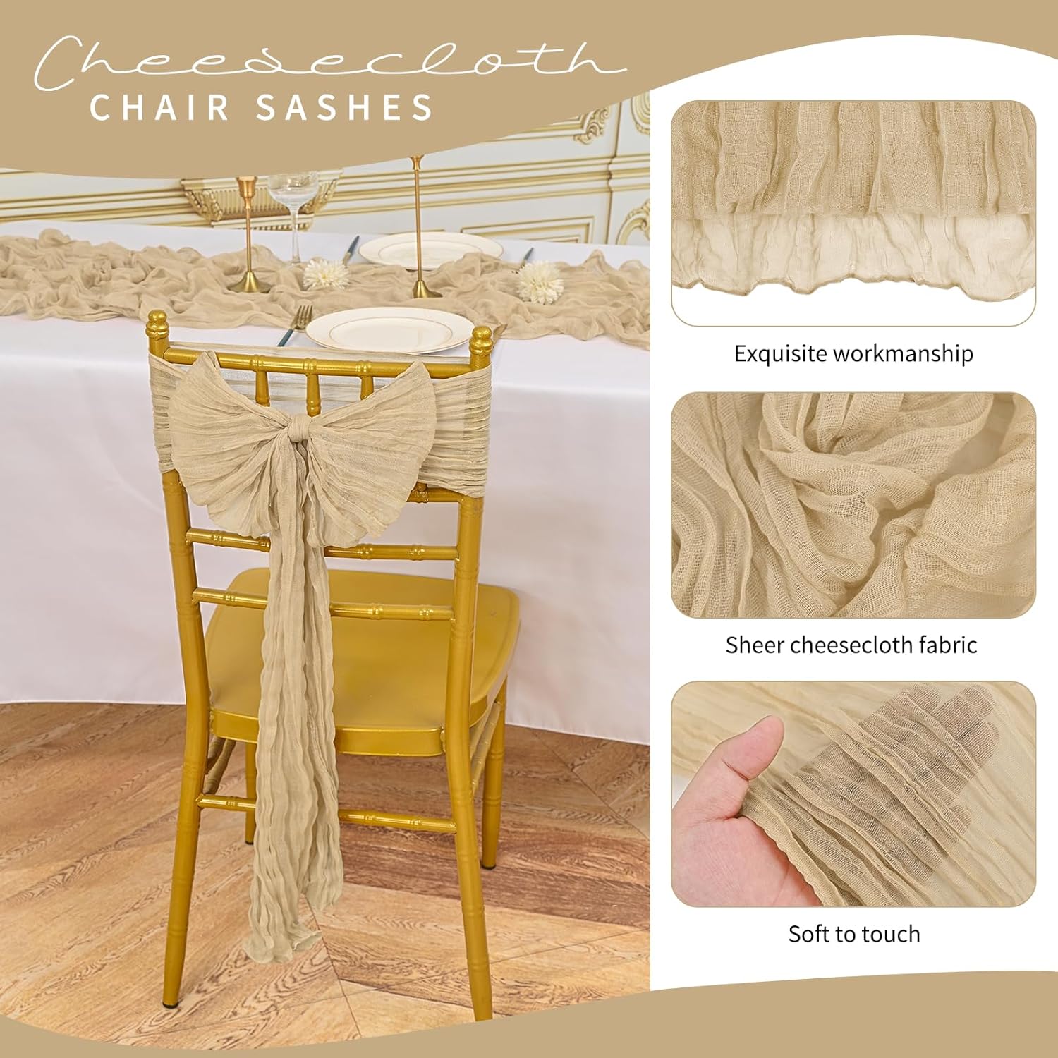 50 PCS Cheesecloth Chair Sashes, Bows Designed ChairSashes, 15.7x108 inch Chair Sashes for Aisle Decorations Universal Chairs Cover Decoration for Wedding Reception Party Banquet (Beige)