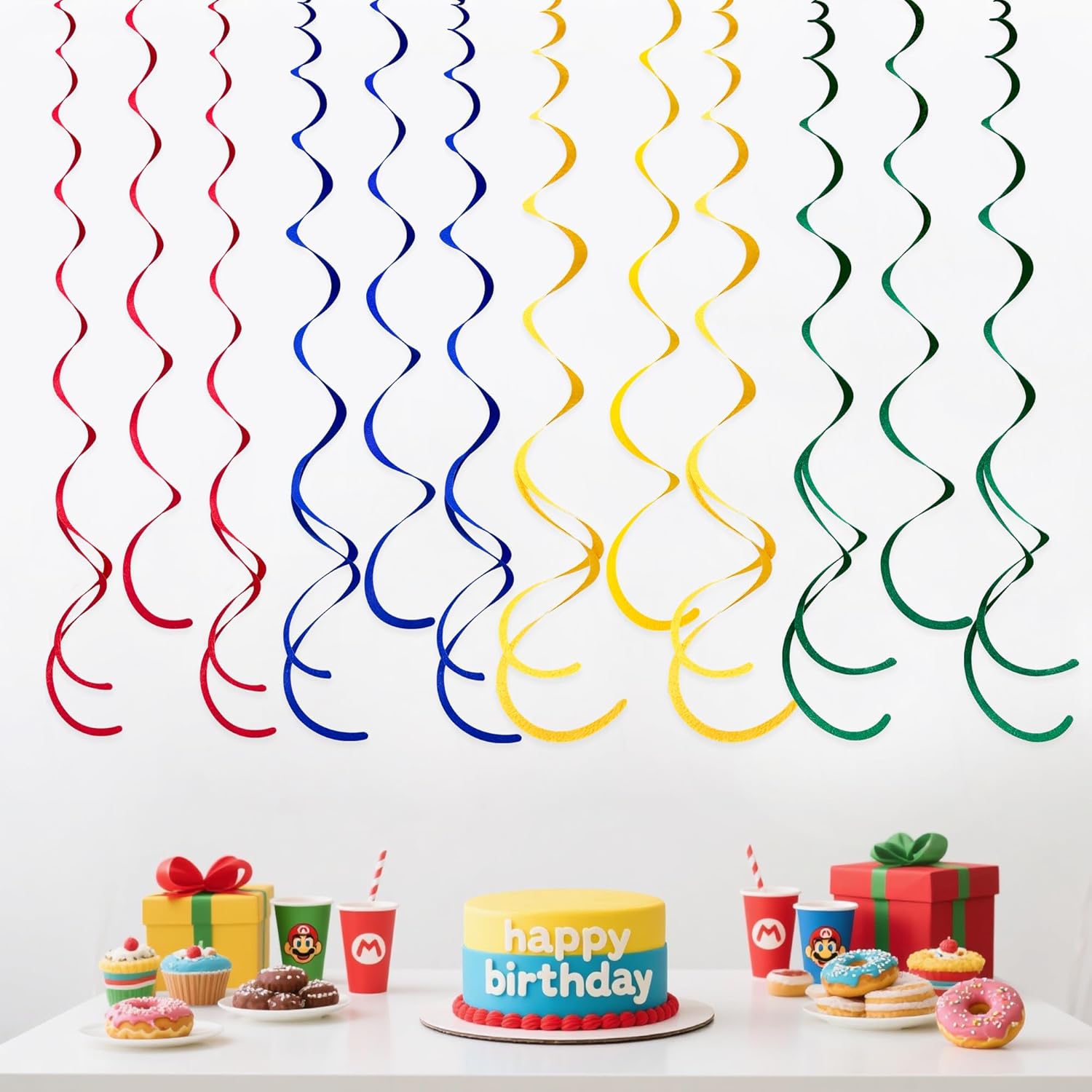 • Package Contains - 36 packs of mario color swirl party streamer,Each swirl can extends to approximately about 2.62 feet long,Meeting daily general needs.Comes with 40 plastic hooks for hanging.