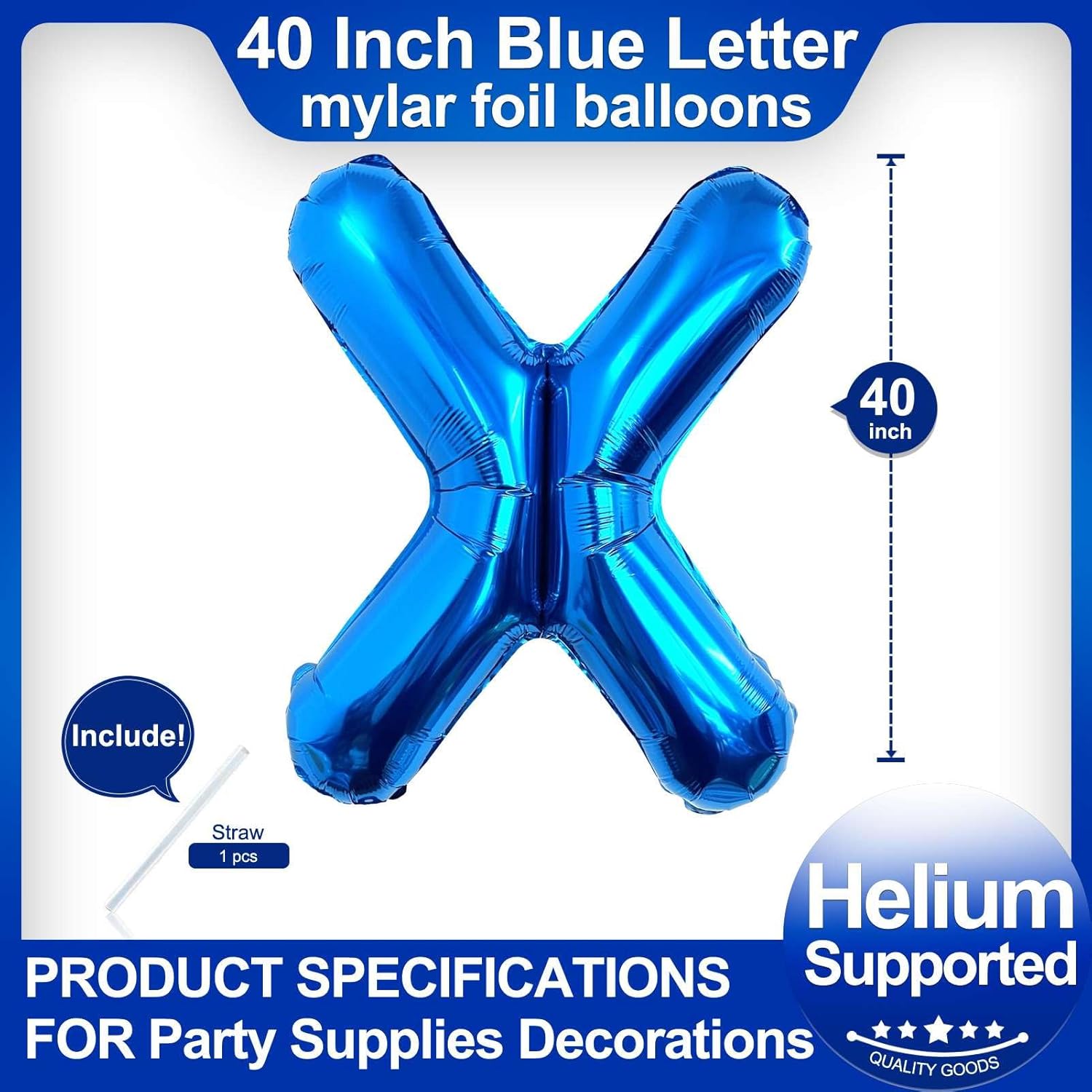 • Package included:One Blue Letter X Balloon*1,straw*1,40 inch Blue letter balloon