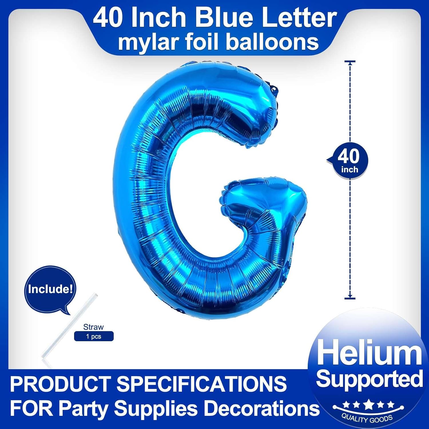 • Package included:One Blue Letter G Balloon*1,straw*1,40 inch Blue letter balloon