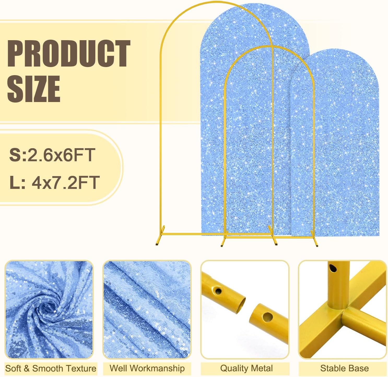 MODFUNS Metal Arch Backdrop Stand and Cover 6&7.2ft Baby Blue Glitter Arch Cover Set of 2 Gold Arch Stand with Covers Double Sided Sequins Arch Covers for Wedding Ceremony Birthday Party Decoration