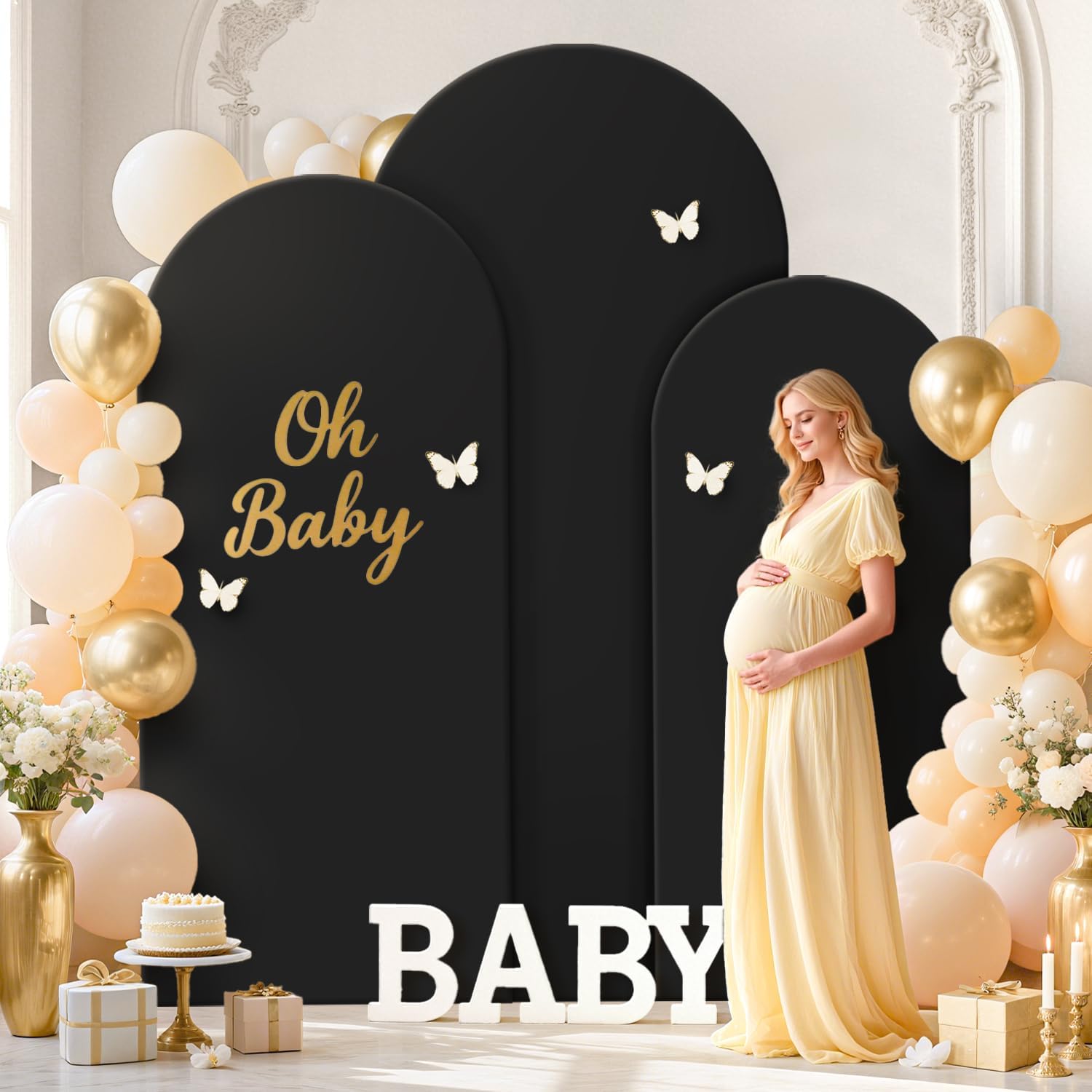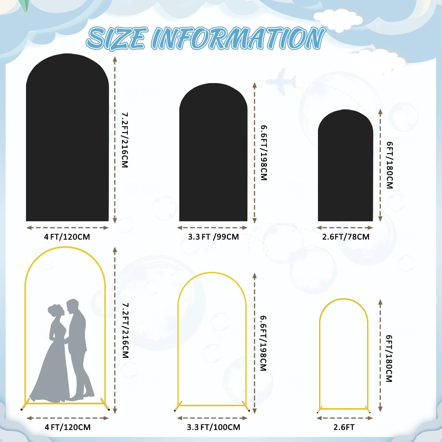 • ๐Ÿงธใ€Size Information- Arch Backdrop Stand and Cover Setใ€‘Arch stand and cover set includes 3 gold metal arch backdrop stands and 3 black arch backdrop cover in sizes 7.2FT x 4FT(H x W), 6.6FT x 3.3FT(H x W) and 6FT x 2.6FT(H x W). The backdrop arch stand with cover is certain to meet your decoration needs and add a charming look to your celebrations.