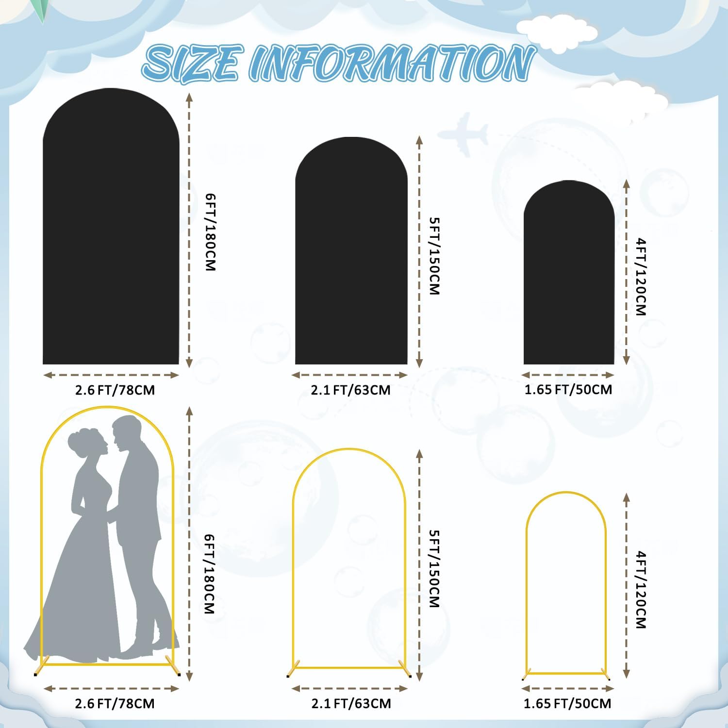 • ๐Ÿงธใ€Size Information- Arch Backdrop Stand and Cover Setใ€‘Arch stand and cover set includes 3 gold metal arch backdrop stands and 3 black arch cover in sizes 6FT x 2.6FT(H x W), 5FT x 2.1FT(H x W) and 4FT x 1.65FT(H x W). The backdrop arch stand with cover is certain to meet your decoration needs and add a charming look to your celebrations.