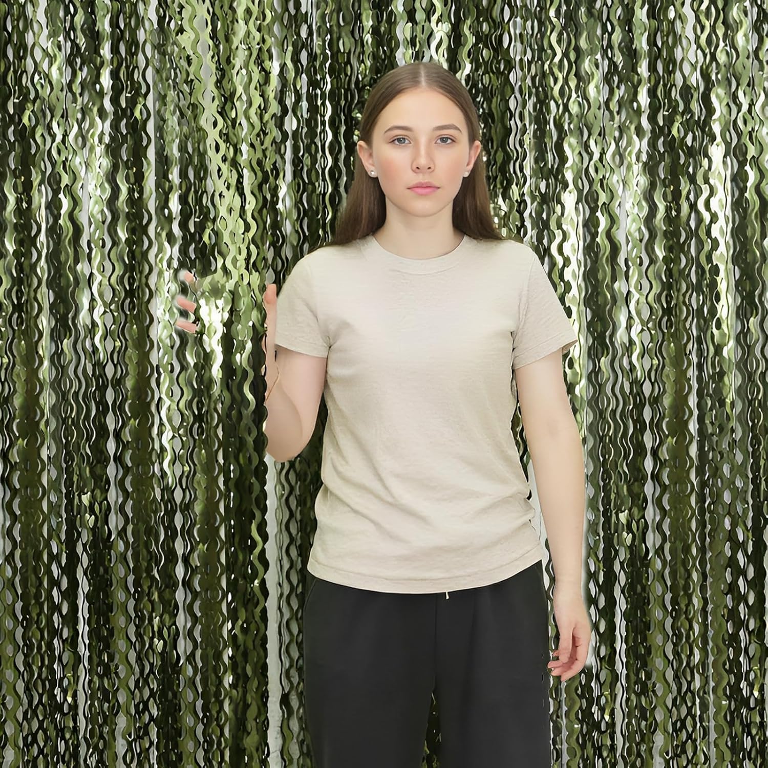 • Package Contents: 4 pack olive green wavy foil fringe curtains,each curtain is 3.3ft x6.6ft,You can cut the metallic backdrop into the suitable length for use,Wonderful accessories for decorating doors and walls