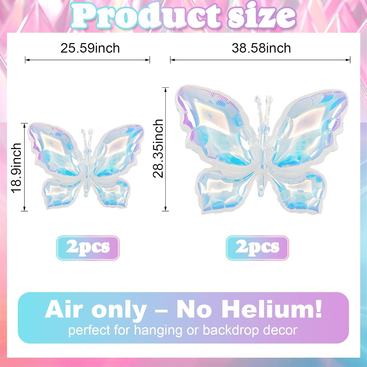 • Iridescent Foil Balloons: Elevate your celebration with our set of 2pcs 25.59*18.9in and 2pcs 38.59*28.35in rainbow butterfly foil balloons. Accompanied by a ribbon, these balloons are ideal for creating a festive and loving atmosphere at any special event.