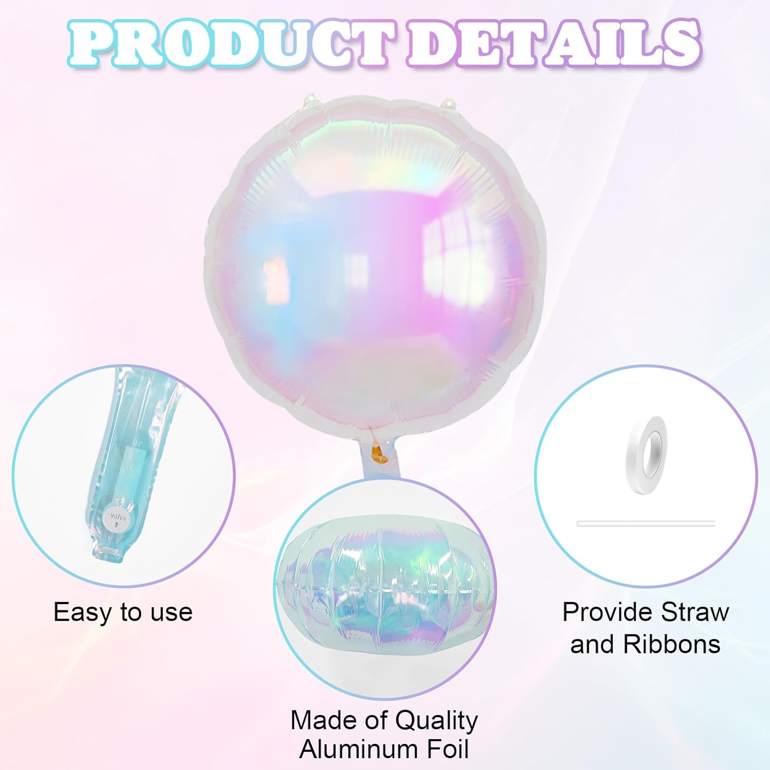 • Easy Setup: Designed for convenience, these iridescent balloons can be easily inflated with air (recommended inflation is 85%-90% to avoid overexpansion). The self-sealing valve ensures they remain inflated, and they can be deflated using a straw for reuse, making them a practical choice for ongoing celebrations.