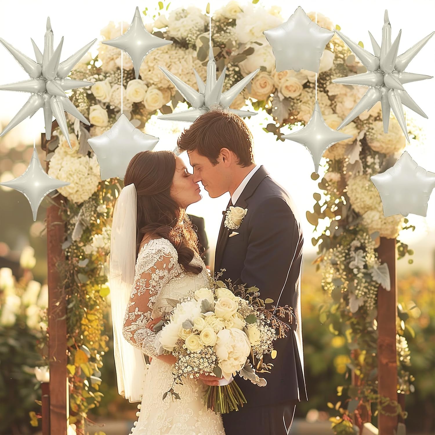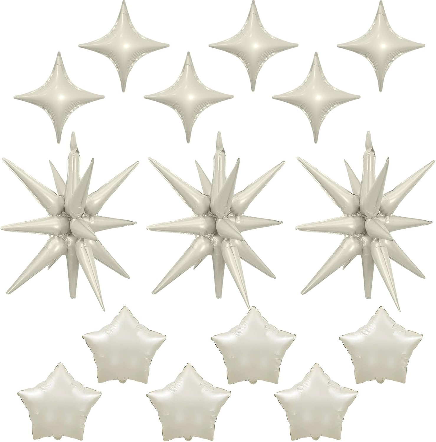 • White Sand Star Balloons: Package includes: cream aluminum foil star balloons (explosion spike Γ— 3, four-pointed stars Γ— 6, five-pointed stars Γ— 6) , a straw and ribbon