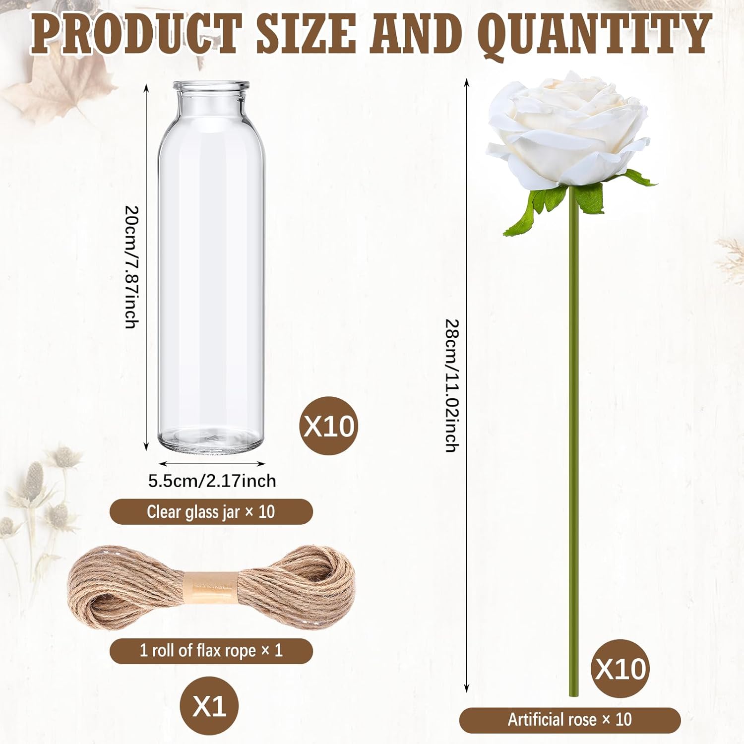 • Detailed Size: our dried pampas grass measures about 16.93 inches/ 43 cm in average height, the artificial roses are about 11.02 inches/ 28 cm, the clear glass jars are about 2.17 x 7.87 inches/ 5.5 x 20 cm and the rope measures about 33 ft/ 10 m, well matching with each other, please check the size before ordering