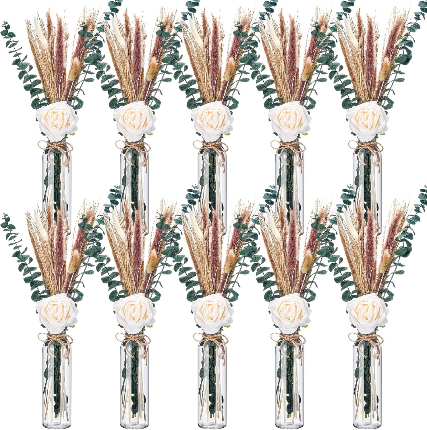 10 Set Dried Pampas Grass Centerpiece for Wedding 10 Clear Glass Jars 10 Artificial Roses 80 Dried Pampas Grass with Rope for Baby Shower Rustic Bridal Party Farmhouse Decoration (White)