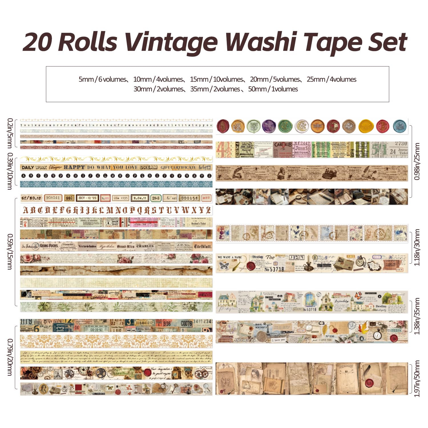 20 Rolls Vintage Washi Tape Set, Floral Letter Butterfly Mushroom Botanical Flower Writable Decorative Tapes for Scrapbooking , Junk Journal Supplies, Bullet Journaling 10-60mm Wide 6.56ft long/Roll