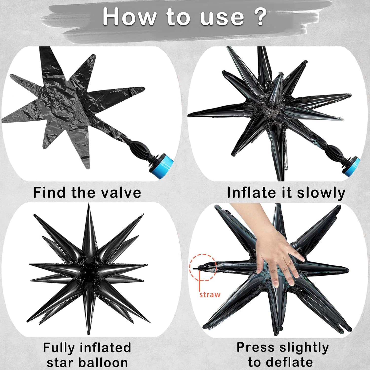 6 Pcs Explosion Star Foil Balloons- 12 Point Star Balloons,Black Spike Balloon and 10Pcs Four Pointed Balloon for Party Supplies Christmas Birthday Wedding Photo Booth