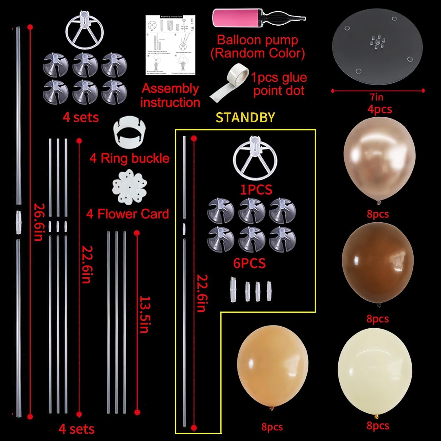 • Package Includes: The balloon arch kit includes 4 reusable balloon stands and 12 inch 32 pcs brown balloons(8 Apricot balloons,8 brown balloons,8 Ivory White balloons and 8 Metallic Champagne Gold balloonsοΌ‰,glue point dots,balloon pump,balloon clips,and tie tool.You don’t need to waste money to buy balloons