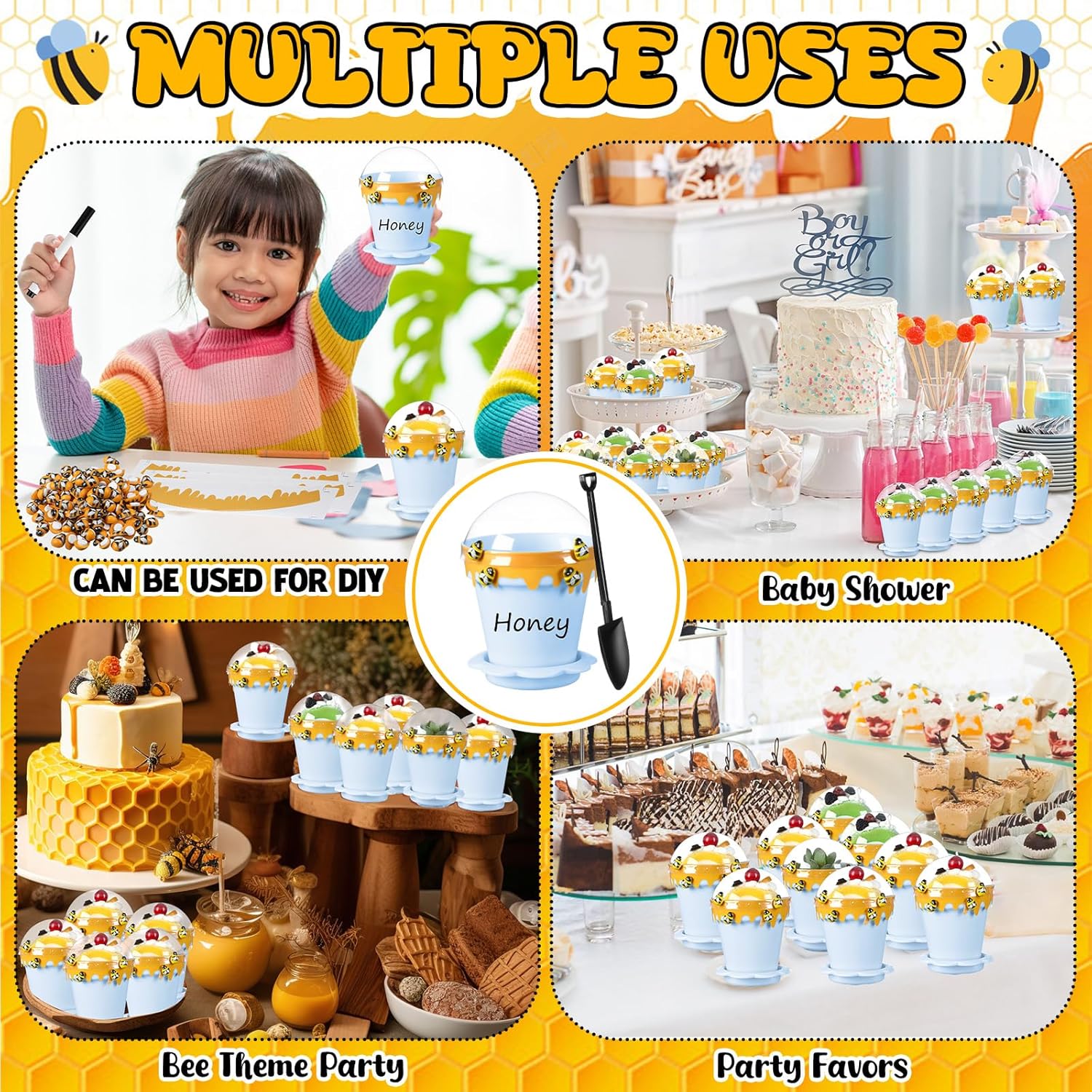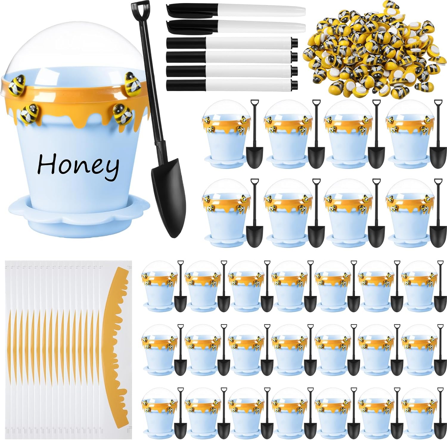 • Package Contains: includes 30 mini honey bee pots, 30 lids, 30 saucers, 30 shovel shaped spoon, 30 stickers, 120 wooden yellow bee decorations, 4 erasable markers, 2 indelible markers, ideal for DIY gifts, unleash your artistic talent to create a special and vibrant display, add fun to your bee party, birthday party, baby shower