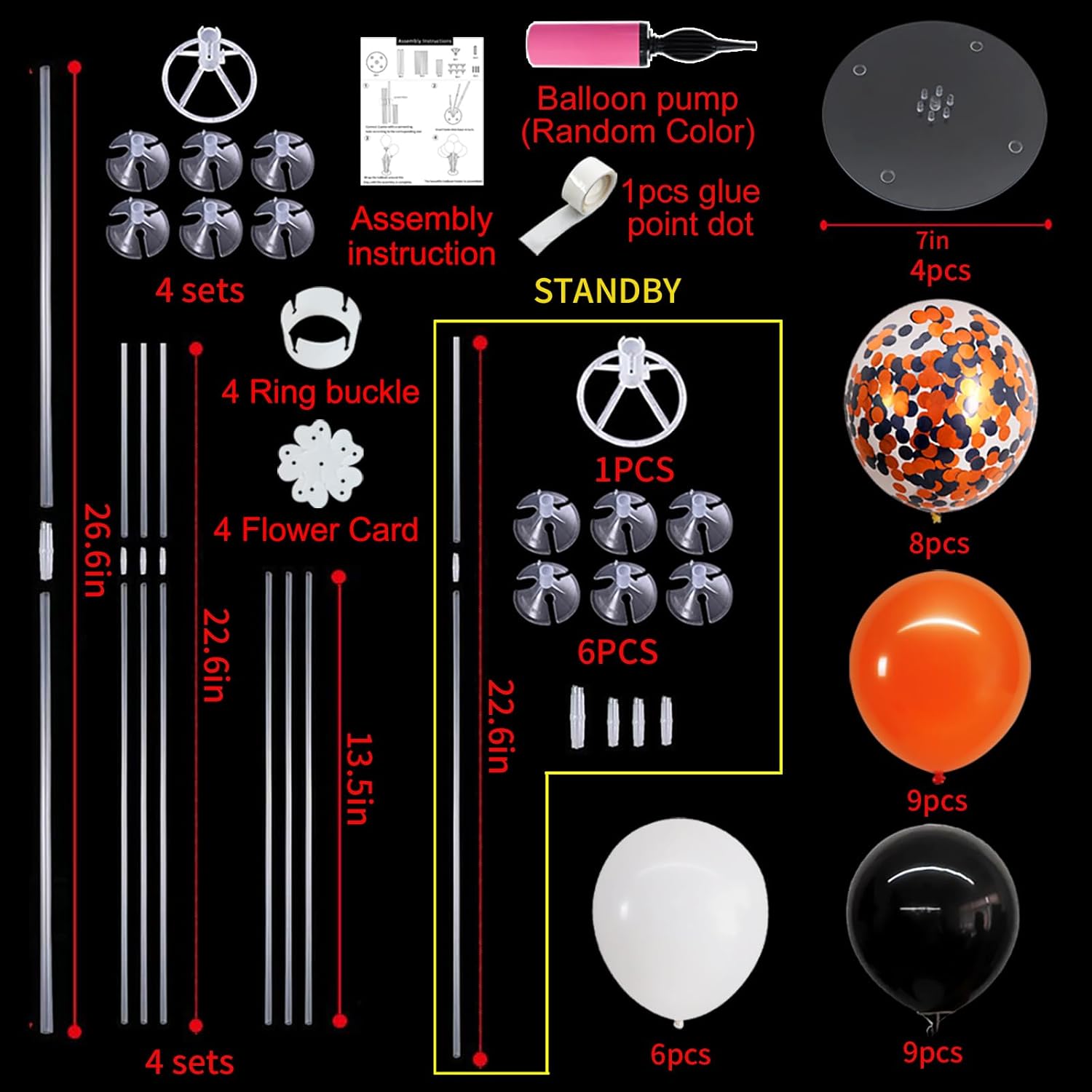 • Included Components : Balloon Stand, Black and Orange Balloons, Filling Pump, Glue, Tying Tool
