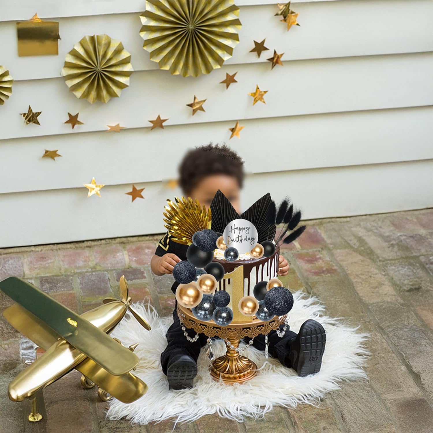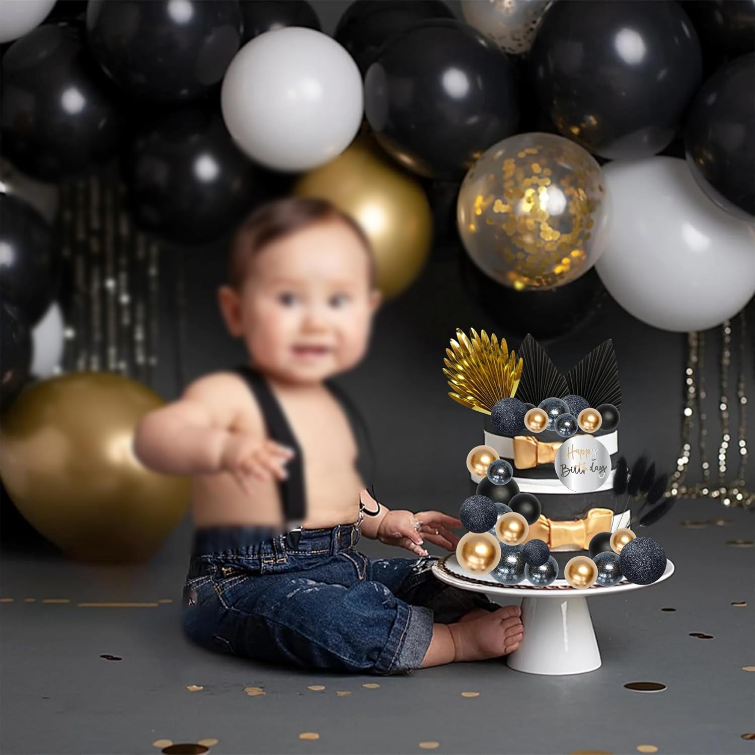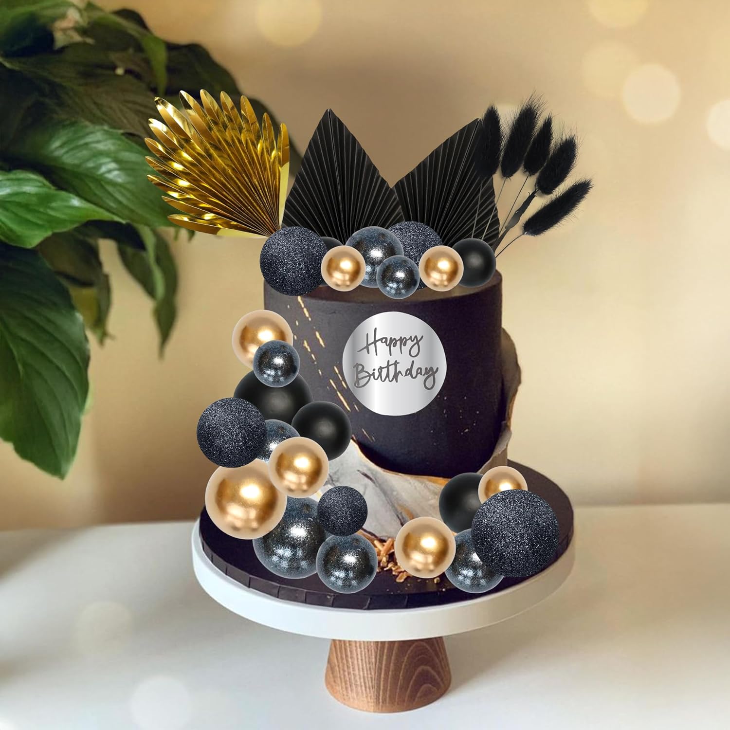 Ephlyn 33 Pack Balls Cake Toppers Boho Palm Leaves Cake Decorations Round Acrylic Happy Birthday Cupcake Toppers for Birthday Wedding Baby Shower Party Supplies Black Gold