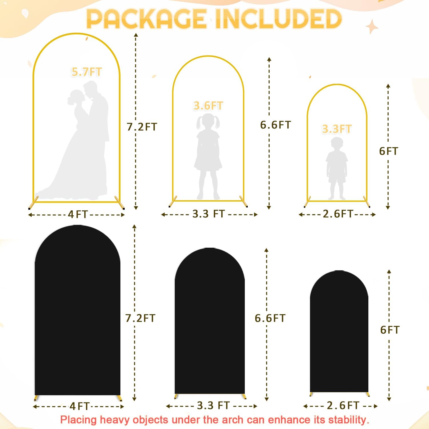 • 🥂【Package Included - Backdrop Arch Stand with Cover】You will receive 3 gold backdrop stand and 3 black arch stand cover. Size: Size: 7.2ft H x 4ft W, 6.6ft H x 3.3ft W, 6ft H x 2.6ft W. Let's create unforgettable moments with our chiara arch backdrop stand set!