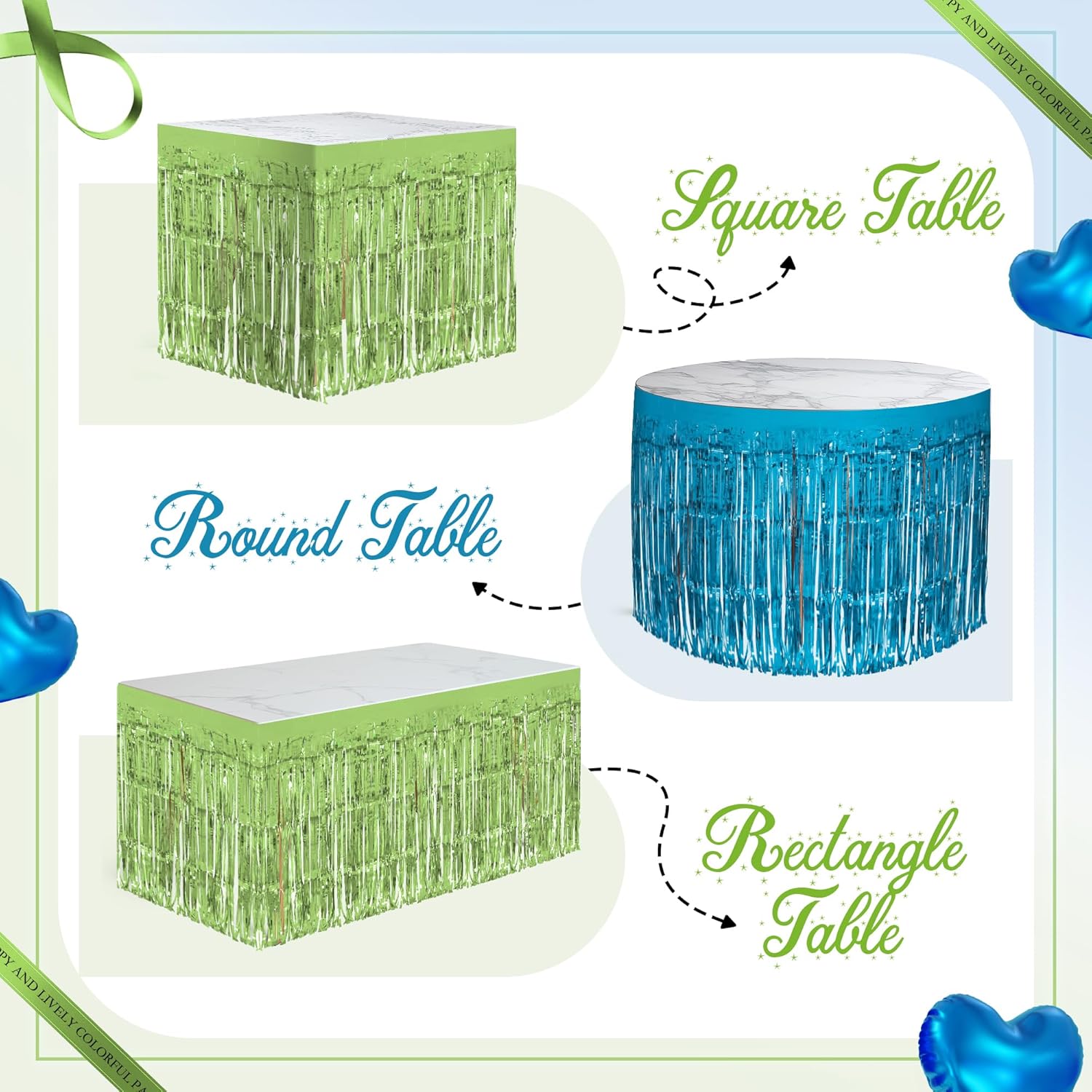 2 Pack Lake Blue Lime Green Table Skirts, 29x108" Metallic Foil Tinsel Fringe Table Skirt for Rectangle Tables Streamer Curtains Backdrop, Party Decorations for Birthdays, Weddings, Holidays