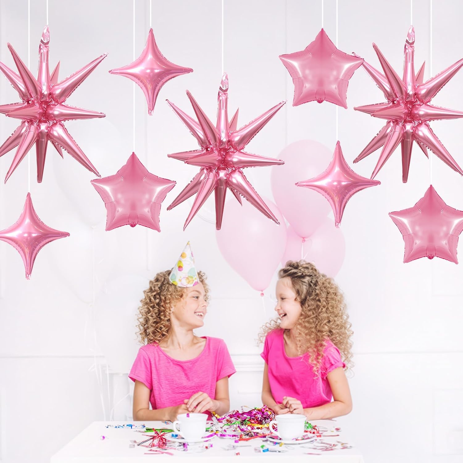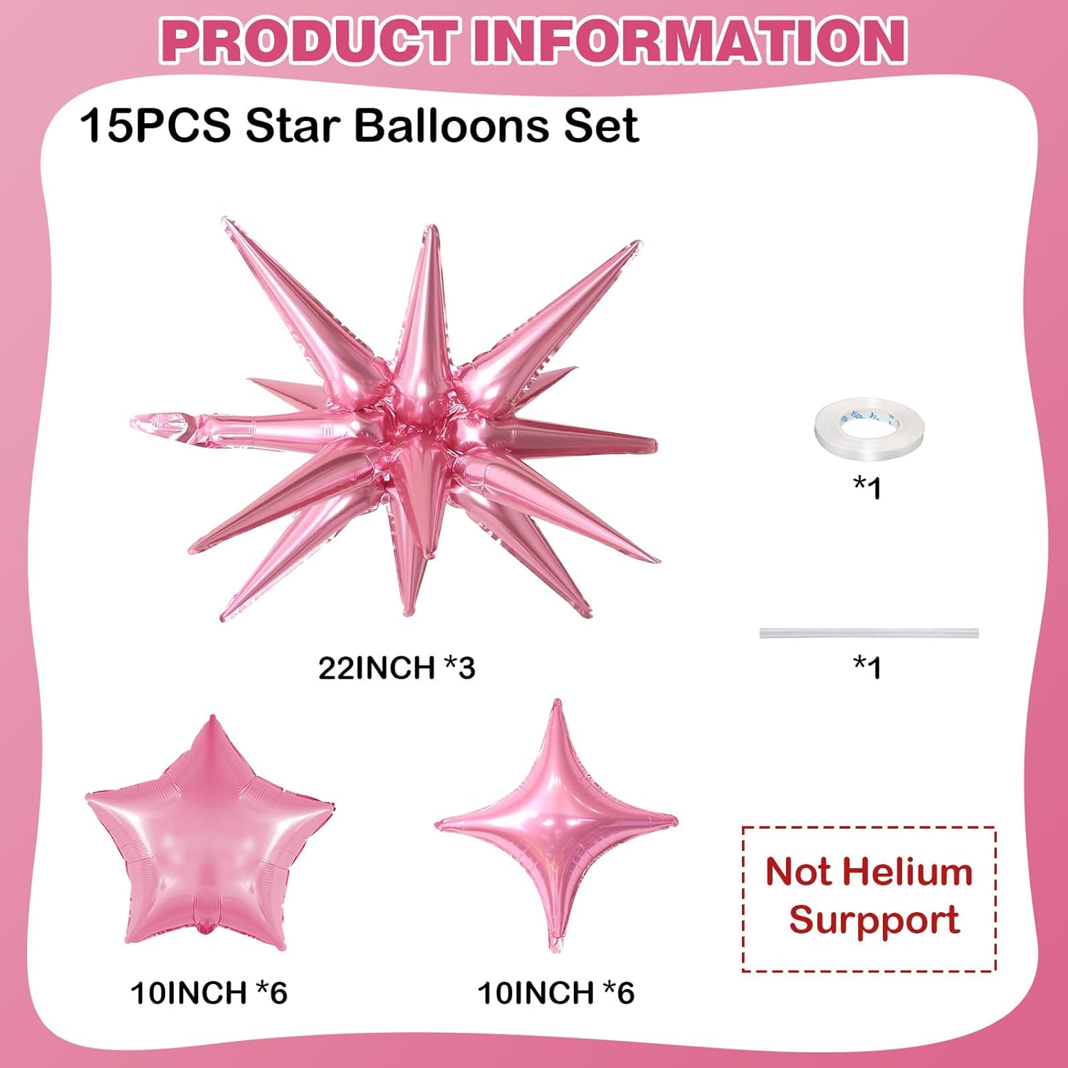 • Pink Star Balloons Set: Package includes: Pink aluminum foil star balloons (explosion stars Γ— 3, four-pointed stars Γ— 6, five-pointed stars Γ— 6) , a straw and ribbon