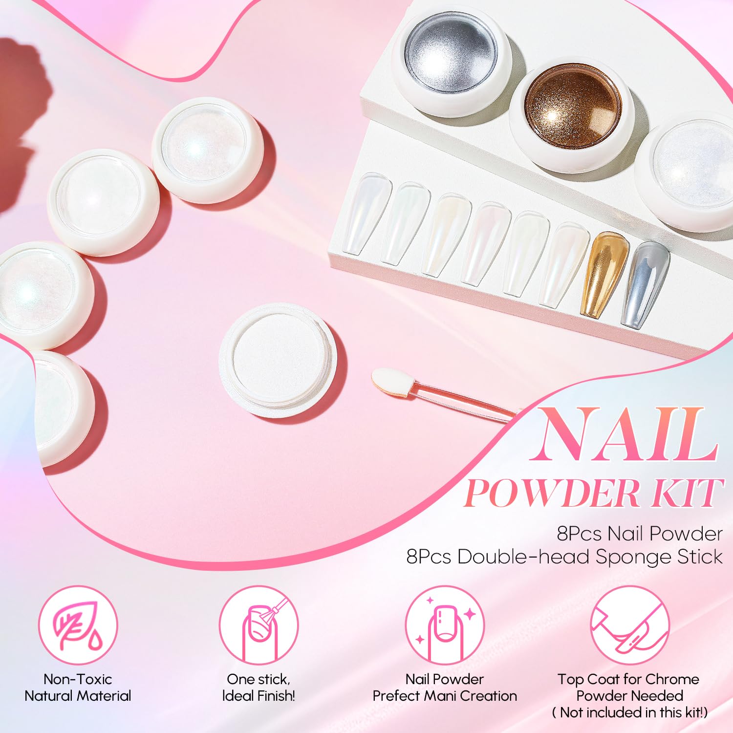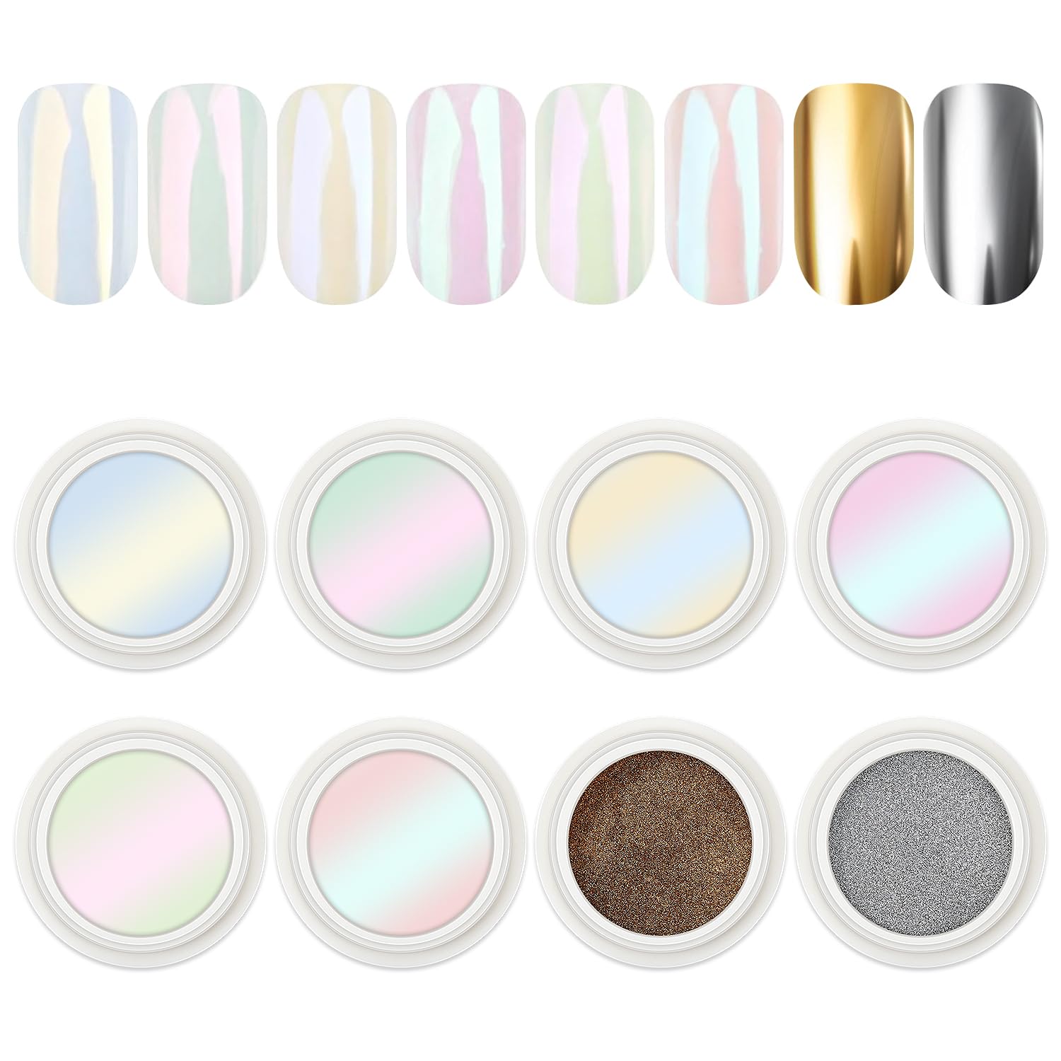 AIMEILI Pearl Chrome Nail Powder, Vegan, Cruelty Free, 8 Colors Aurora Metallic Holographic Mirror Effect Nail Art Pigment Iridescent Shell Glitter Nail Art