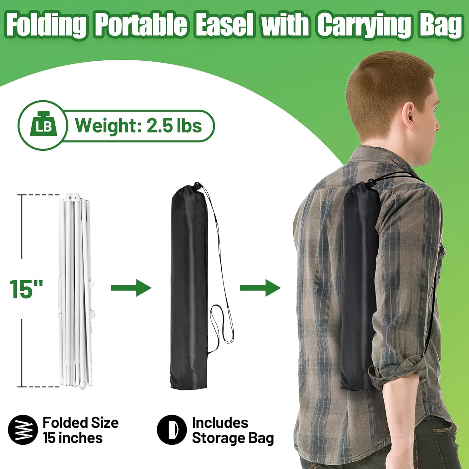 • Folding Portable Easel: The easel weighs 2.5 pounds and folds up to 15 inches; and comes with a carrying bag for easy storage and on-the-go carry
