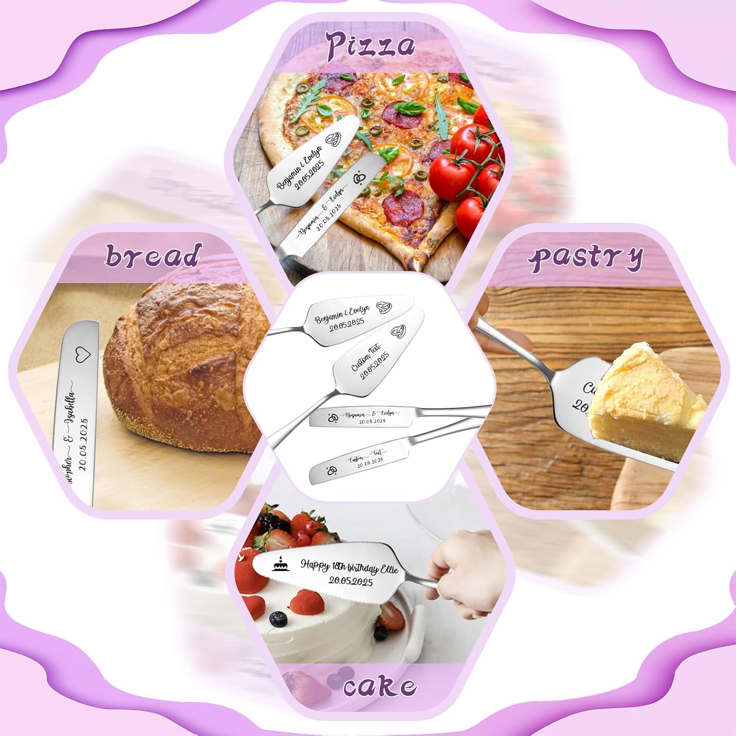 • Personalized Wedding Cake Knife and Server Set:Our wedding cake cutting set features personalized design as the core highlight, injecting a unique romantic imprint into your wedding! Using laser engraving technology, you can engrave the names of the bride and groom, wedding date, or exclusive love motto on the cake knife and server set, making the tableware an "exclusive token" that carries emotions