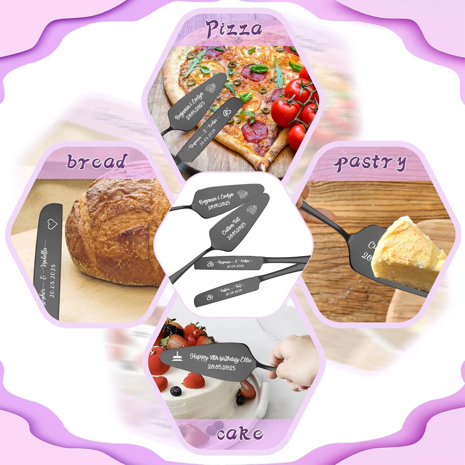 • Personalized Wedding Cake Knife and Server Set:Our wedding cake cutting set features personalized design as the core highlight, injecting a unique romantic imprint into your wedding! Using laser engraving technology, you can engrave the names of the bride and groom, wedding date, or exclusive love motto on the cake knife and server set, making the tableware an "exclusive token" that carries emotions