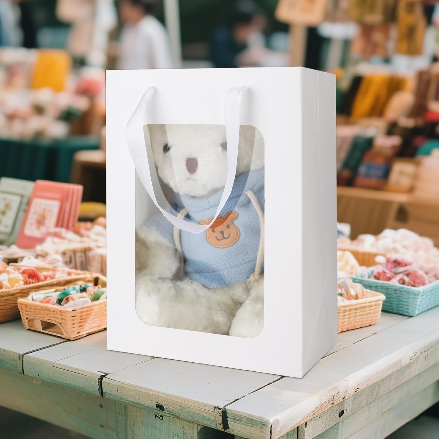 MOXARYSU 12 Pcs White Gift Bags with Clear Window: 9.8x5.1x7.1 Inch Medium Kraft Paper Bags with Handle For Party Business Birthday Wedding (White,12p)