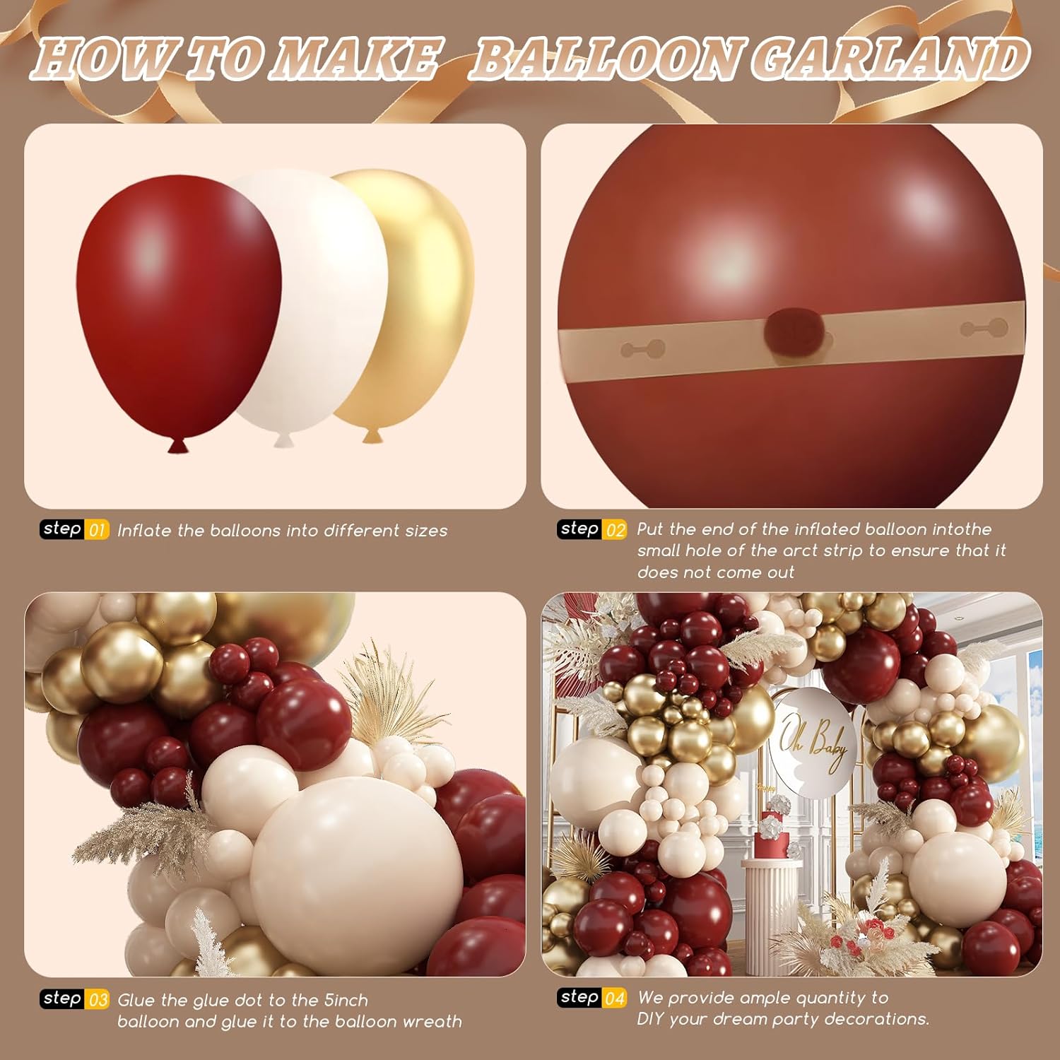 • Package List :maroon and gold balloons includes 18" burgundy/metallic gold/sand white balloons(12 pcs), 12" burgundy/metallic gold/sand white balloons(100 pcs), 10" burgundy/metallic gold/sand white balloons(100 pcs), 5" burgundy/metallic gold/sand white balloons(100pcs),glue dotsx200, ribbonx2, decorative stripx2. plenty in quantity, Perfect for maroon and gold graduation decorations
