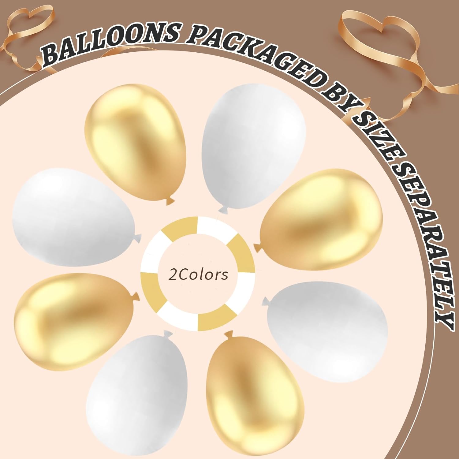 • Package List :gold and white balloon arch kit includes 18" white /metallic gold balloons(12 pcs), 12" white /metallic gold balloons(100 pcs), 10"white /metallic gold balloons(100 pcs), 5" white /metallic gold balloons(100pcs),glue dotsx200, ribbonx2, decorative stripx2. plenty in quantity, Perfect for White Metallic Gold Latex Balloon Garland kit and party balloons