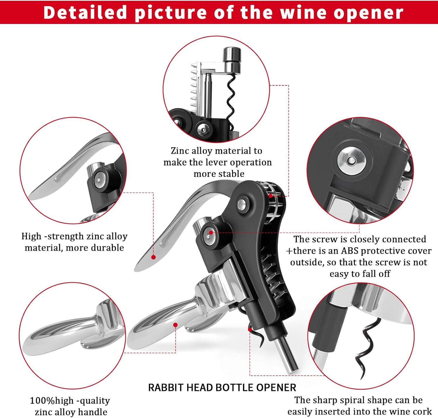 • 1.No Broken Cork: Our rabbit bottle opener is made of high-quality zinc alloy with a low-profile matte black coating on the surface. The durable screw is suitable for corks of various structures, and our spiral part is specially coated with Teflon to ensure that the cork can be pushed in smoothly with just a light pull. Say goodbye to the trouble of cork breakage