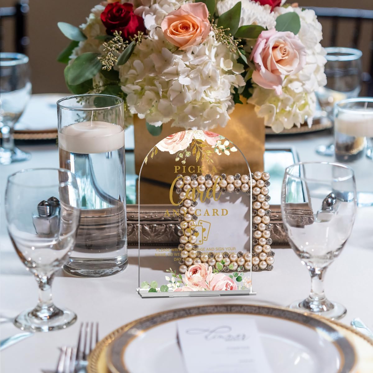 Acrylic Wedding Signs, Bridal Shower Decorations, Pick A Card Signs for Reception, Modern Calligraphy Arch Acrylic Table Top Sign for Wedding Reception and Engagement Parties (Clear Pink Flowers)