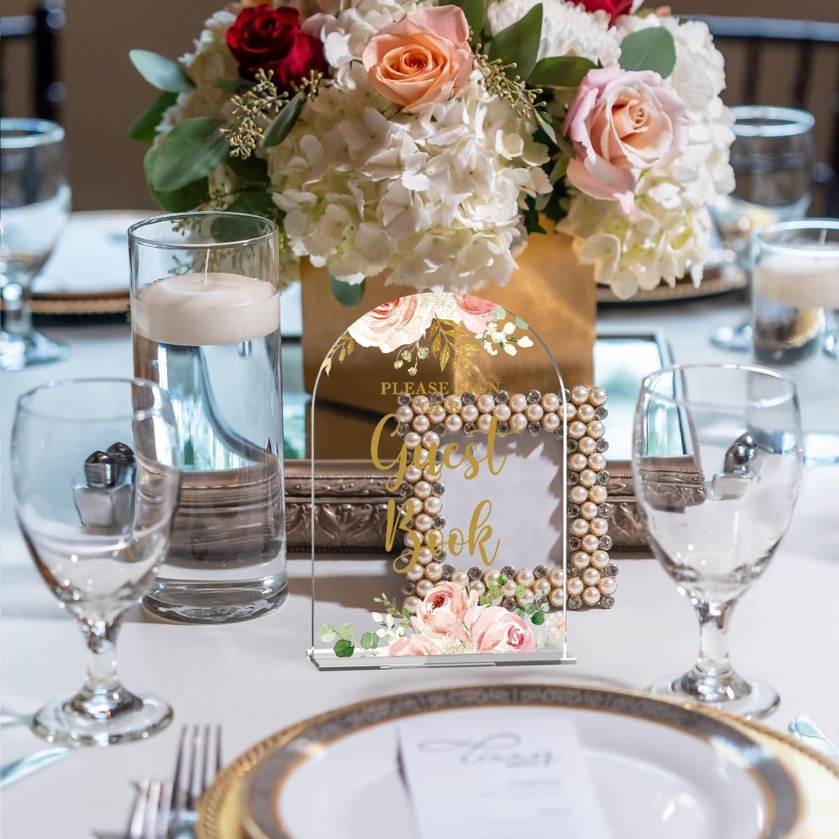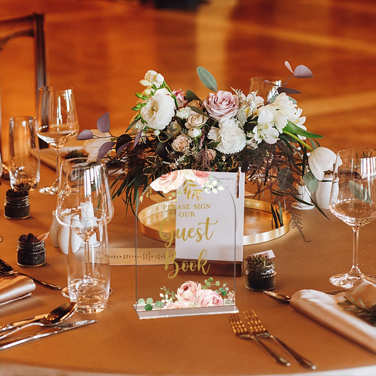 Acrylic Wedding Signs, Bridal Shower Decorations, Please Sign Our Guestbook Signs for Reception, Modern Calligraphy Arch Acrylic Table Top Sign for Wedding Reception (Clear Pink Flowers)