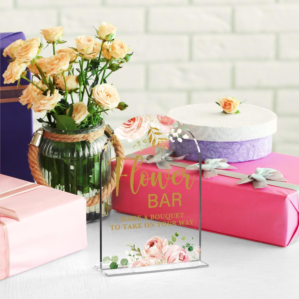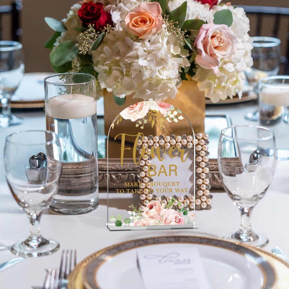 Acrylic Wedding Signs, Flower Bar Desk Decor, Flower Bar Signs for Ceremony, Modern Calligraphy Arch Acrylic Table Top Sign for Wedding Reception and Engagement Parties (Clear Pink Flowers)