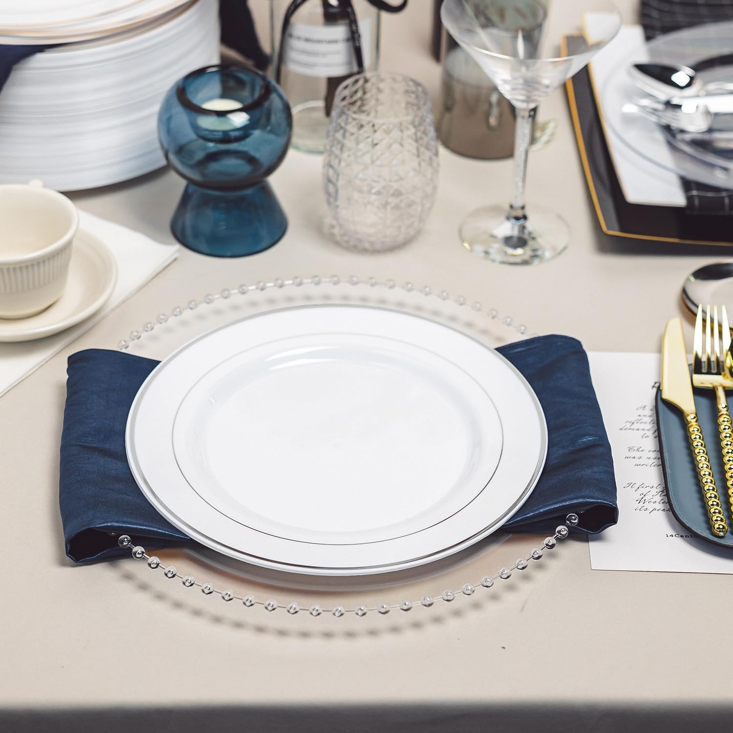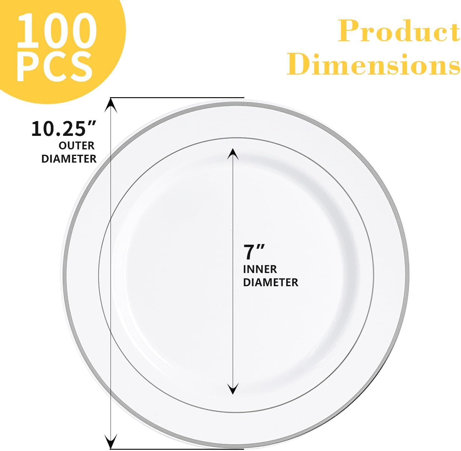 • GREAT VALUE 100 PACK: Each pack comes with 100 pcs silver 10.25 inch dinner plates, perfect for large gatherings, the white disposable dinner plates with silver rim can serve for 100 guests. Having these will complete your plastic dinnerware collection