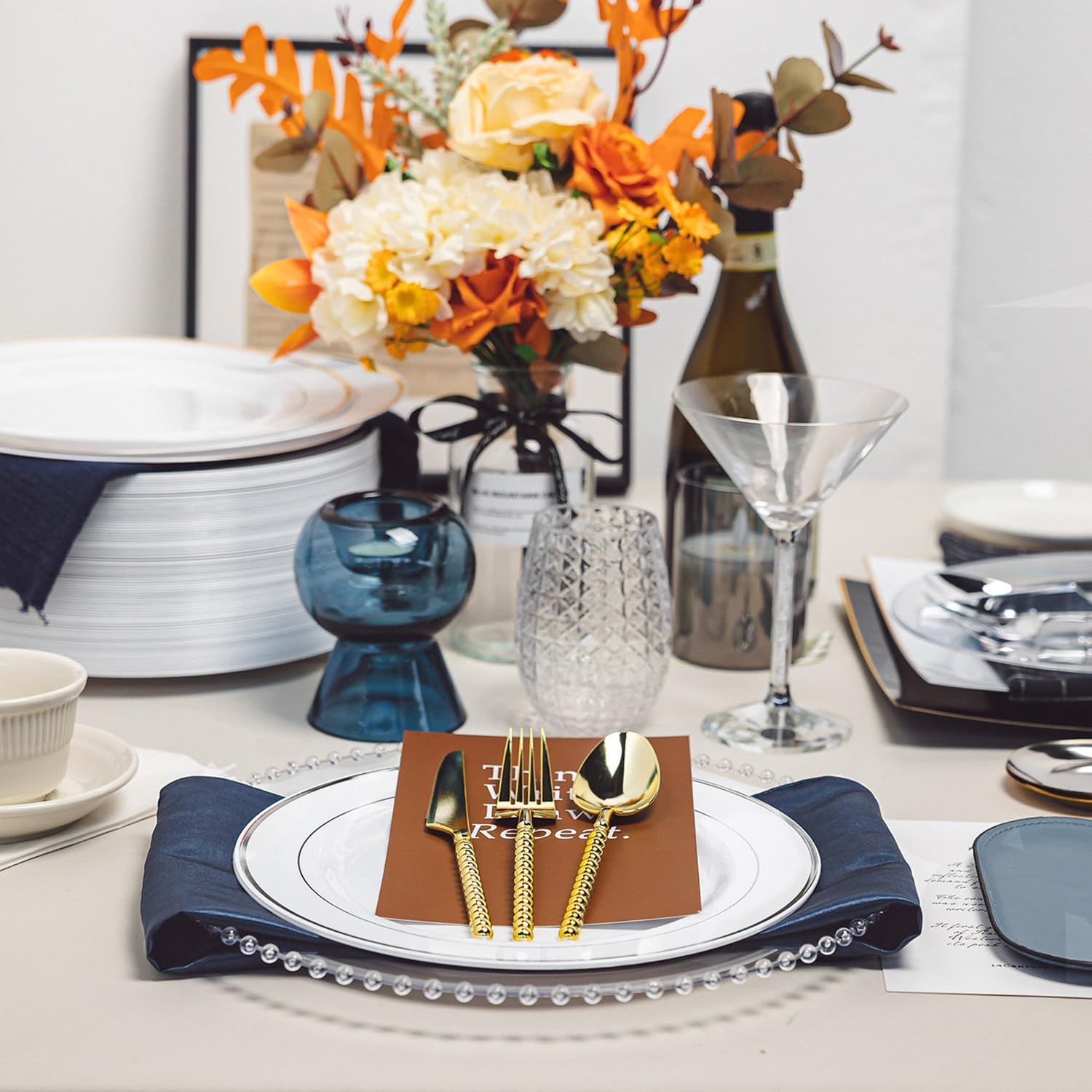 • DISPOSABLE AND REUSABLE: Our silver disposable dinner plates feature a minimalist design—no patterns or prints. Simply rinse with water after use to restore their like-new shine. With minimal care, these durable plates can be dried and reused