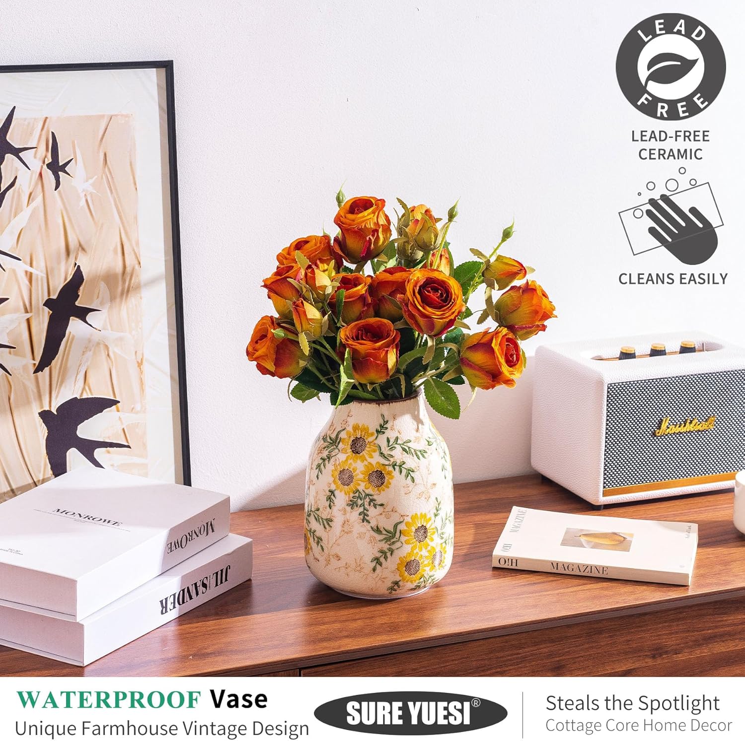 • HAND-PAINTED SUNFLOWER DESIGN: Featuring intricate hand-printed sunflower and green leaf patterns on a beige ceramic base, this vintage vase blends Tuscan farmhouse charm with Chinoiserie-inspired motifs. Perfect for vintage home decor enthusiasts seeking floral centerpieces or grand millennial style accents.