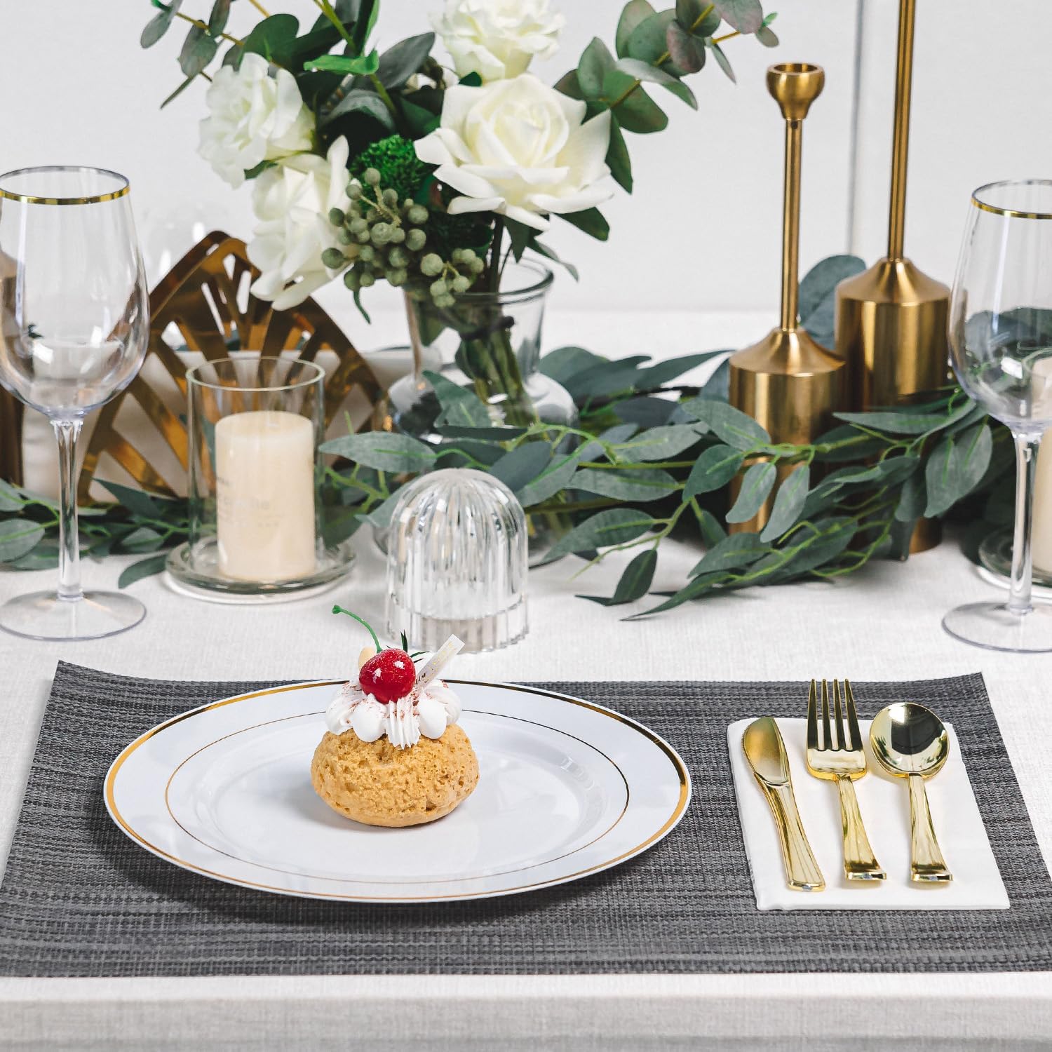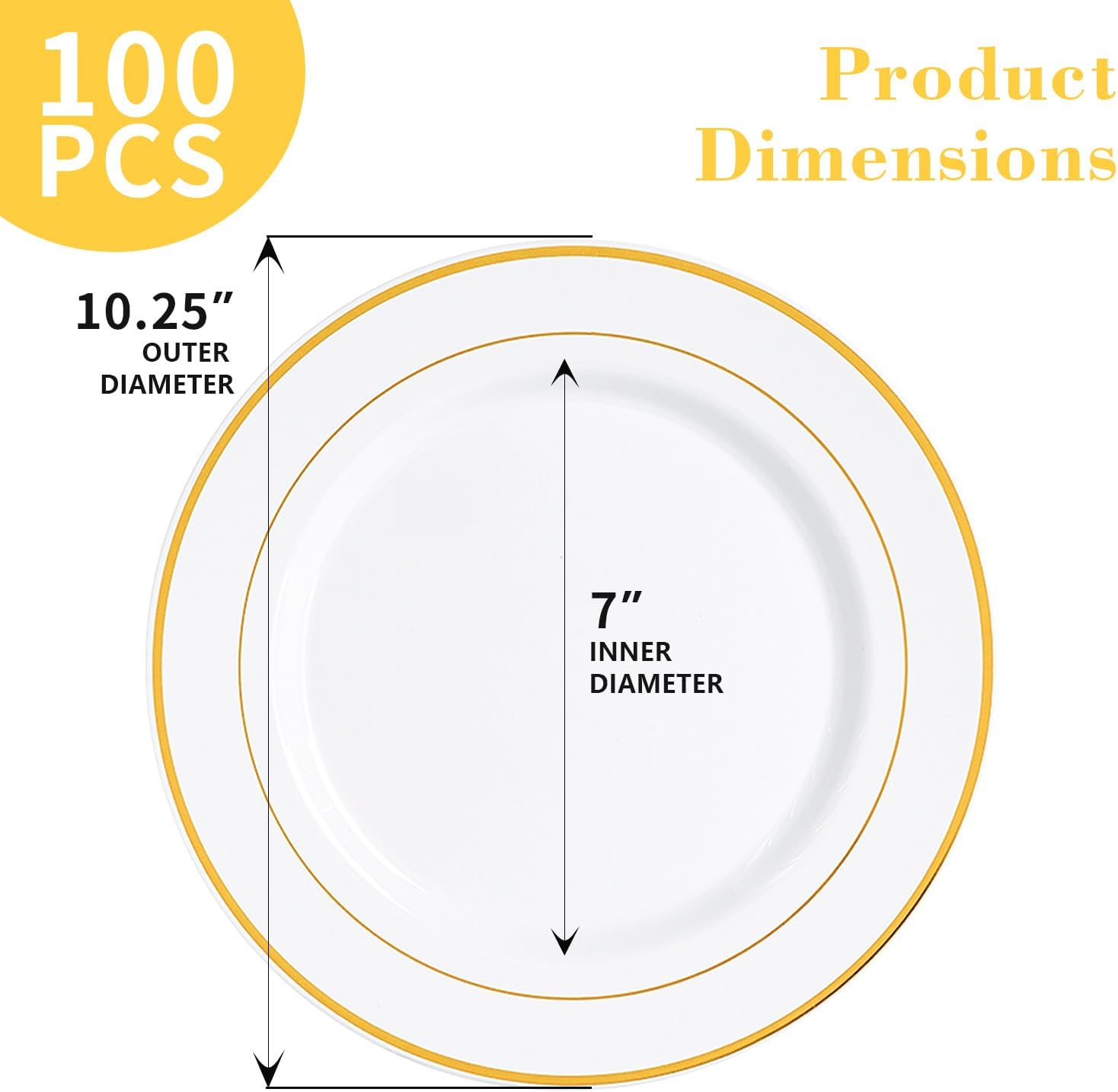 • GREAT VALUE 100 PACK: Each pack comes with 100 pcs gold 10.25 inch dinner plates, perfect for large gatherings, the white disposable dinner plates with gold rim can serve for 100 guests. Having these will complete your plastic dinnerware collection