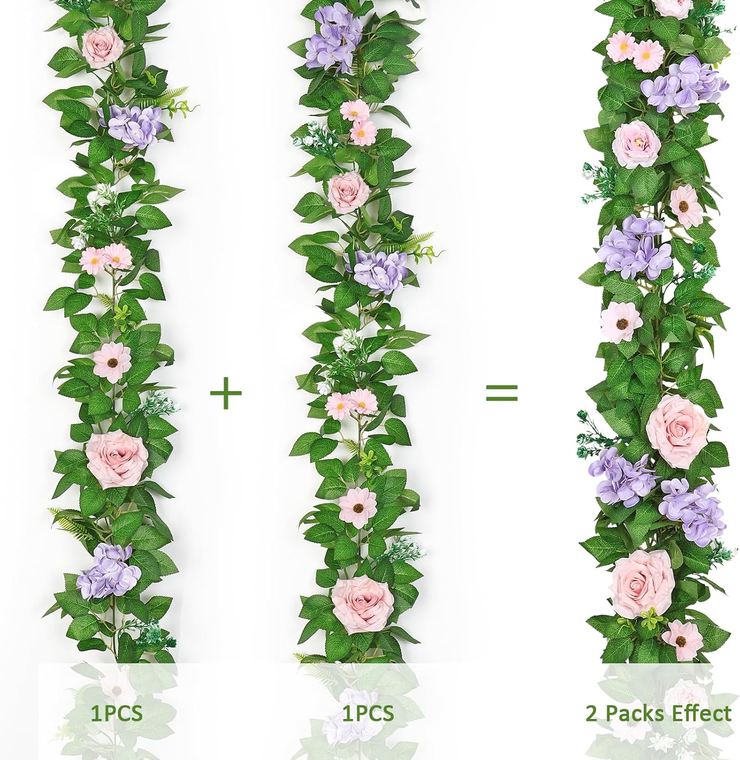 • 【Match with Rich Leaves and Flowers】Our greenery garland has approximately over 40 branches with dense leaves , giving your space a vibrant and lively feeling. Each consists of 3 kinds of silk leaves in different size and species. Each floral garland contains 6 different types of flowers, including roses, baby daisies, hydrangeas and more. The flowers are skillfully arranged, full and highly ornamental.Floral garland adds a lively and dazzling spring touch to your home decorations.