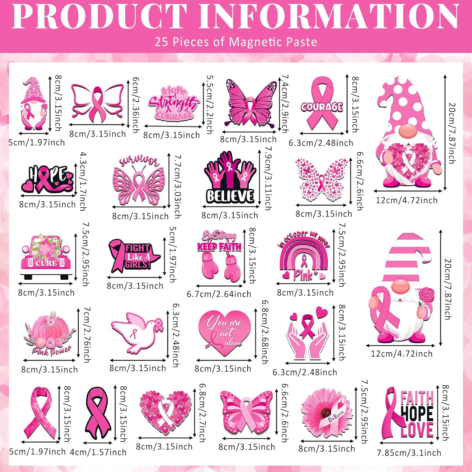 • Breast Cancer Awareness Decoration: a total of 25 pieces of lovely refrigerator magnet stickers, with pink as the theme, build a warm atmosphere; Our breast cancer awareness car magnets are with all kinds of essential classic elements of breast cancer awareness, such as pink ribbon, pumpkin, butterfly, love heart, dove of peace, flowers, faith, hope, love, so that you can express your care for breast cancer patients