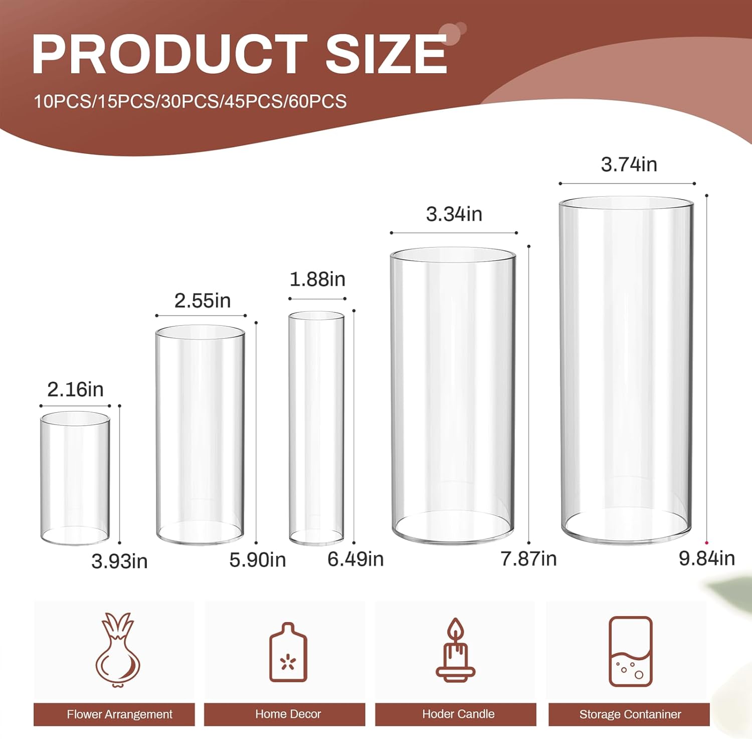 • 5-Size Cylinder Vase Set for Versatility​ From minimalist single stems (2.1×3.9 inchs) to lavish bouquets (3.7×9.8 inchs), 30 premium ​Cylinder vases​ in 5 sizes fit orchids, roses, or succulents.