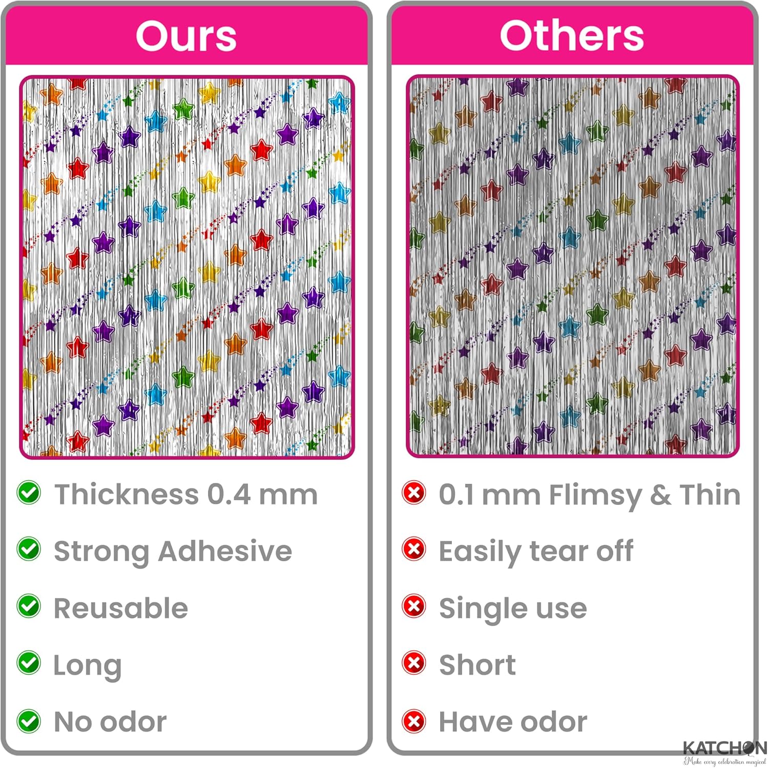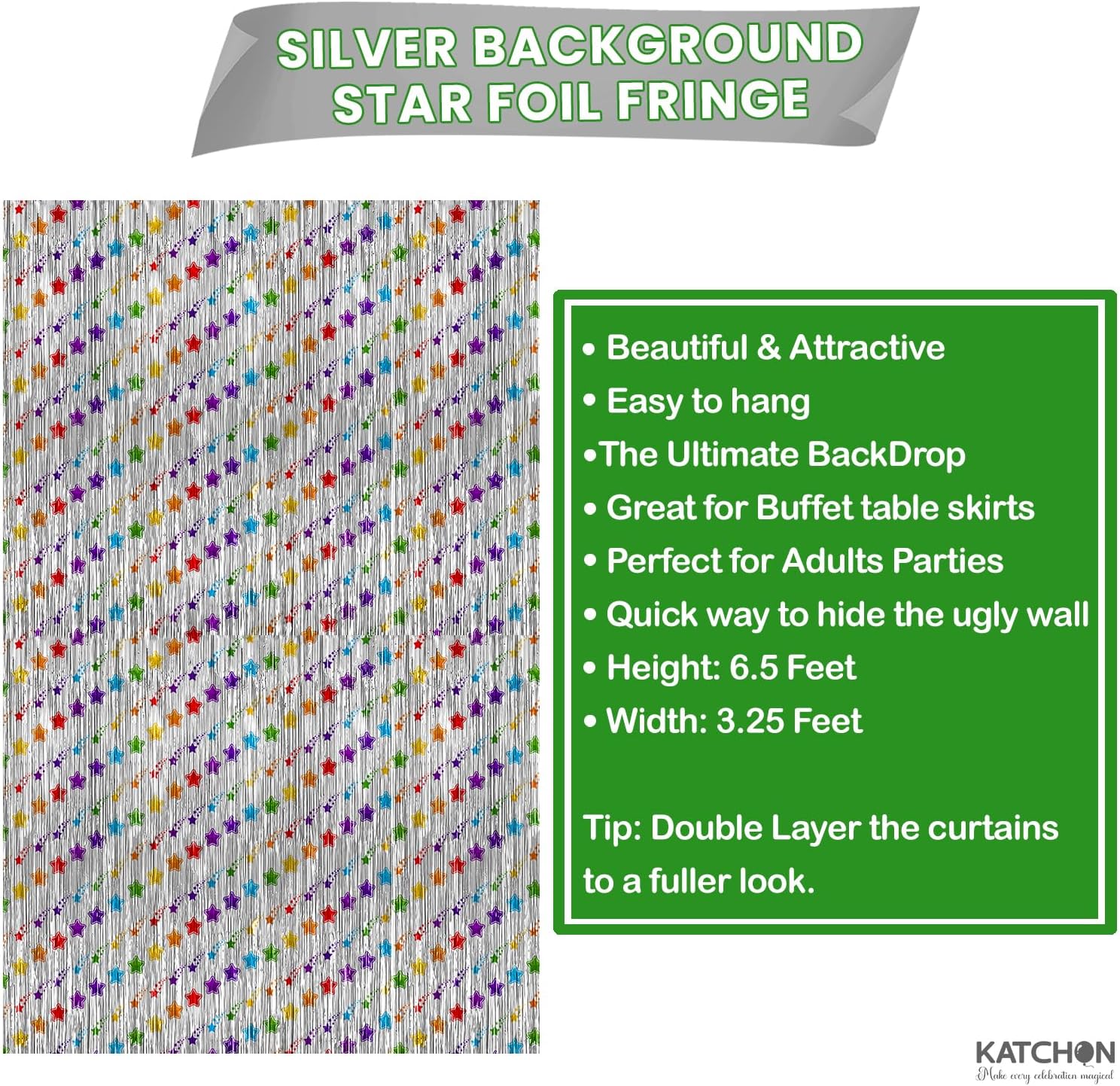 • STURDY AND REUSABLE | HIGH QUALITY : This pack includes 2 silver foil fringe curtain panels with a rainbow star design that shines bright and ishigh quality product which is sturdy enough to be reused as silver door streamers, silver wall fringe, or a fun silver backdrop curtain for playrooms, classrooms, or photo booths. The star foil adds charm to any silver streamer backdrop, silver streamers backdrop, silver garland backdrop, or party backdrop for birthdays, baby showers, or themed events.
