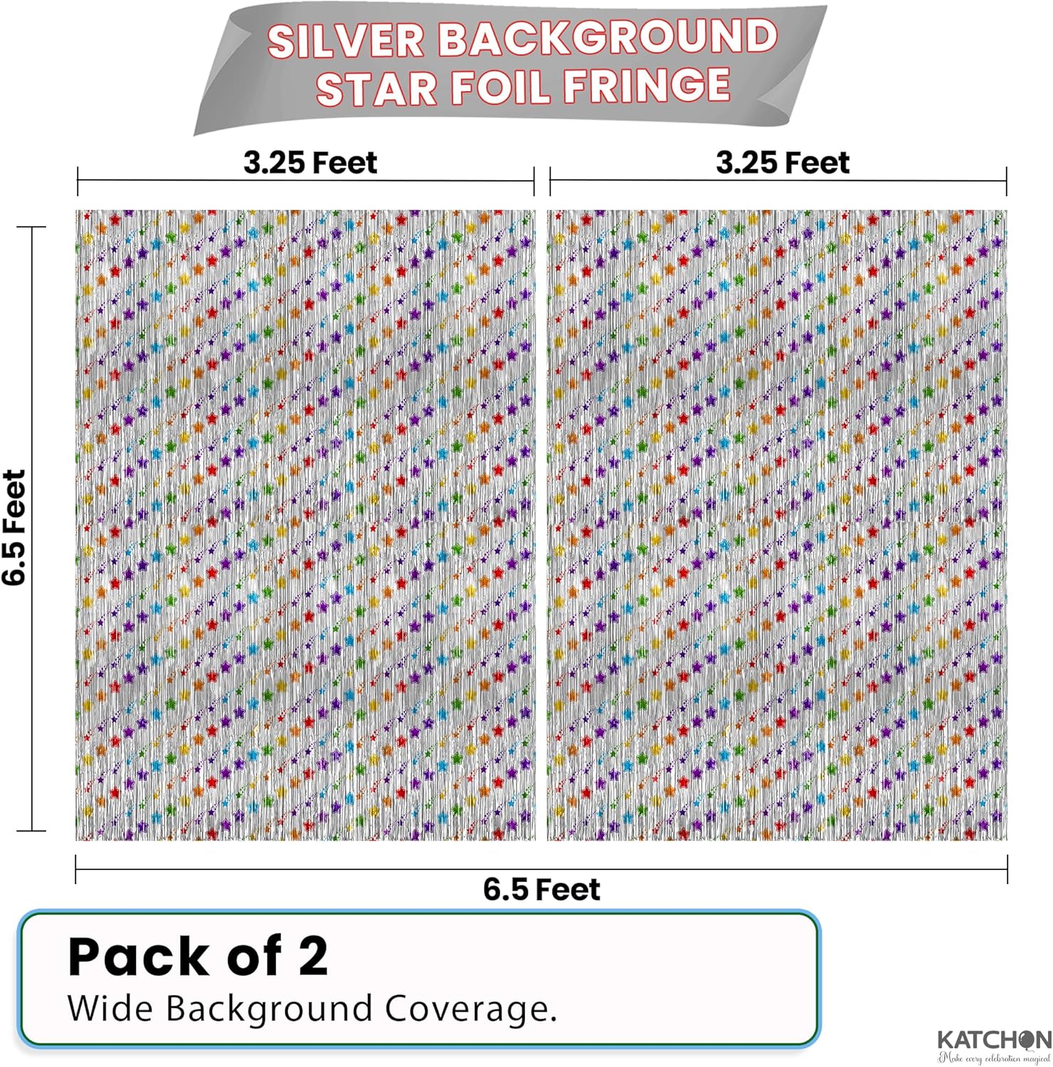 • LARGE SIZE AND PACK OF 2 : This star foil fringe curtains which measures 3.2 X 6.5 and comes in Pack of 2 is made of shiny metallic silver foil with colorful stars in purple, blue, yellow, and red. Each banner measures 3.2 feet wide by 6.5 feet tall, creating a vibrant silver fringe backdrop that’s ideal for silver party decorations, silver shimmer wall backdrop, silver photo backdrop, birthday party decorations, or silver backdrop for parties, Labor Day Decorations, and more. Also works beautifully as a silver backdrop or silver backdrop curtain for themed setups.