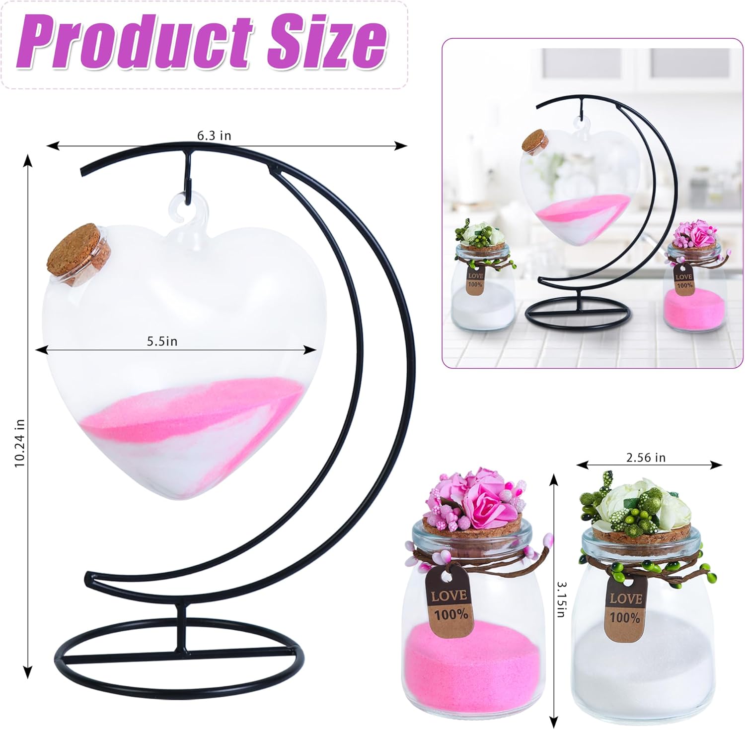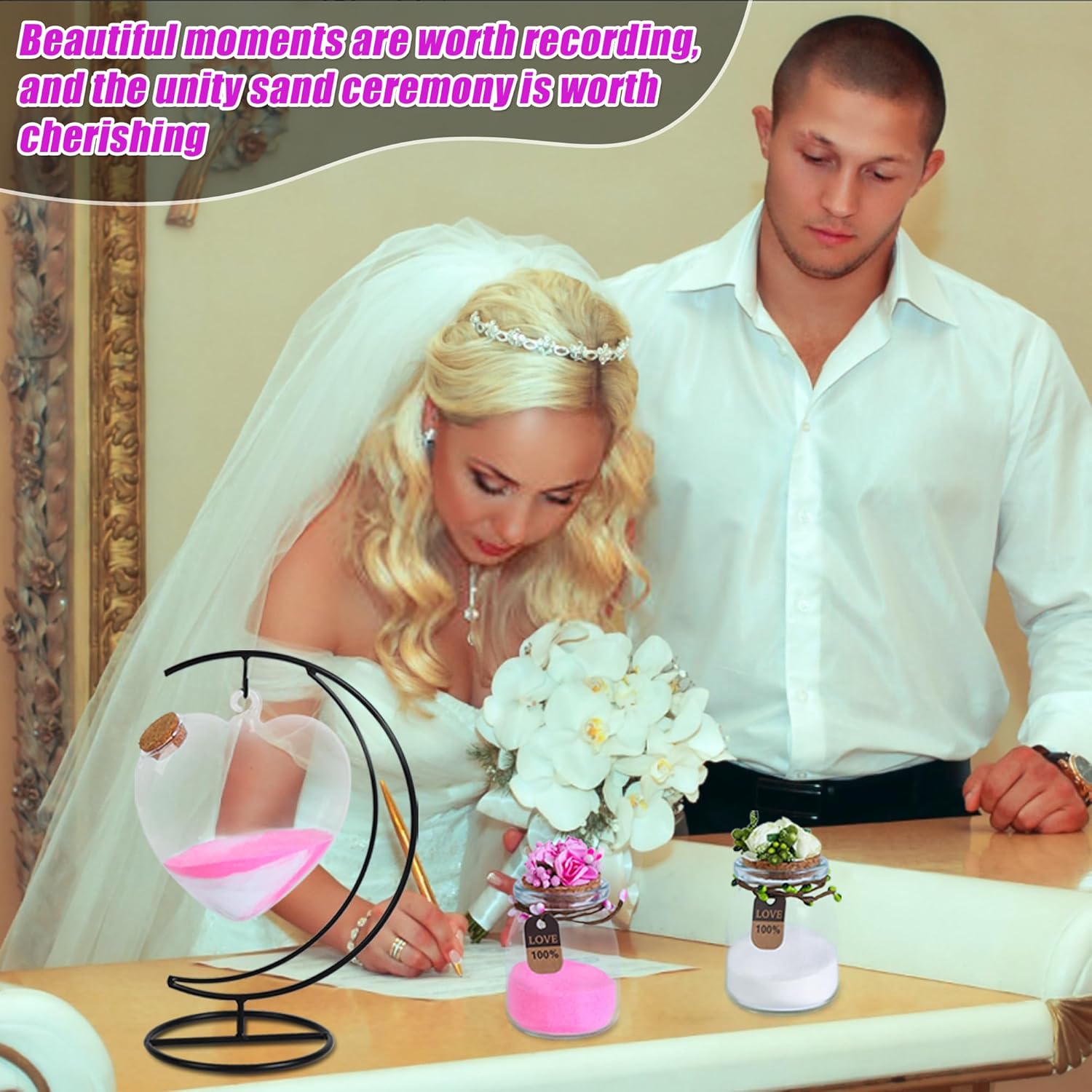 • Cute wedding sand ceremony kit: Unified sand wedding set includes a moon stand, a heart-shaped bottle with a wooden stopper that can be hung on the moon stand, 2 bags of wedding sand in different colors (white and pink), 2 ceremonial vases with flower garlands and white or pink flower caps, suitable for your wedding, creating an unforgettable sand ceremony and leaving a unique commemoration