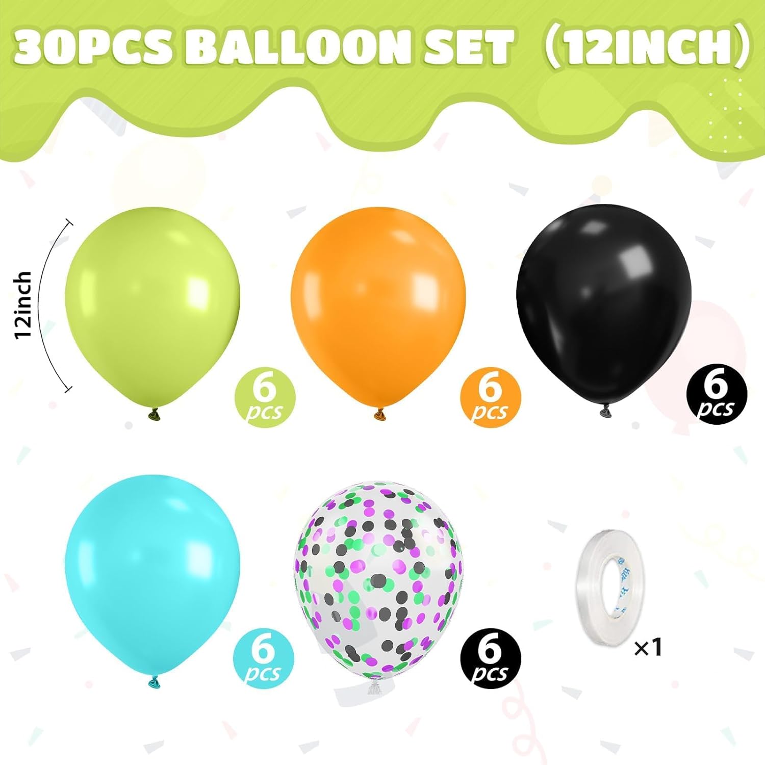 • 【12 Inch Green Orange Black Balloons Balloons Set】Fruit green balloons (6 pcs),orange balloons (6 pcs),black balloons (6 pcs),teal balloons (6 pcs),colorful confetti balloons (6 pcs),white balloon ribbon (1 roll), 30pcs in our green orange black balloon set. Suitable for decorating various occasions, such as boys party birthday baby shower anniversary graduation.