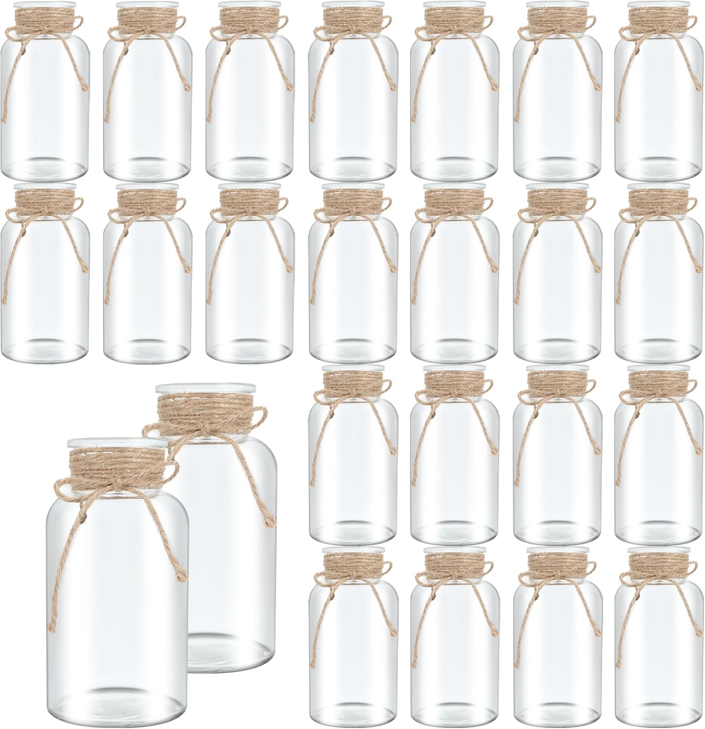 • 🏺Package Included: a set of 24 glass vases. The central decorative size of each glass vase is 3.1 "diameter x 6.3" height, and the bottle mouth diameter is 2.28 inches. Equipped with simple hemp rope, it has a clear and retro appearance and an elegant design, and can be used to decorate different flowers
